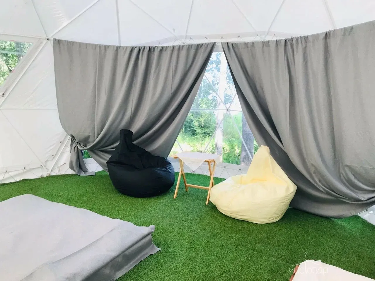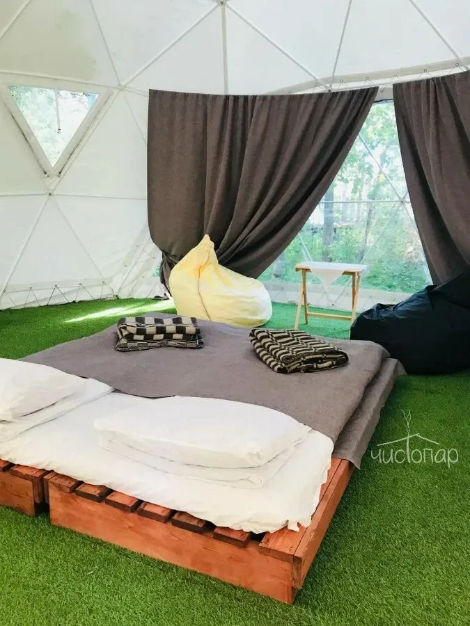 Каждая сфера оснащена всем необходимым: холодильник, чайник, гейзерная кофеварка, френч-пресс комплект посуды, постельное белье, полотенца.