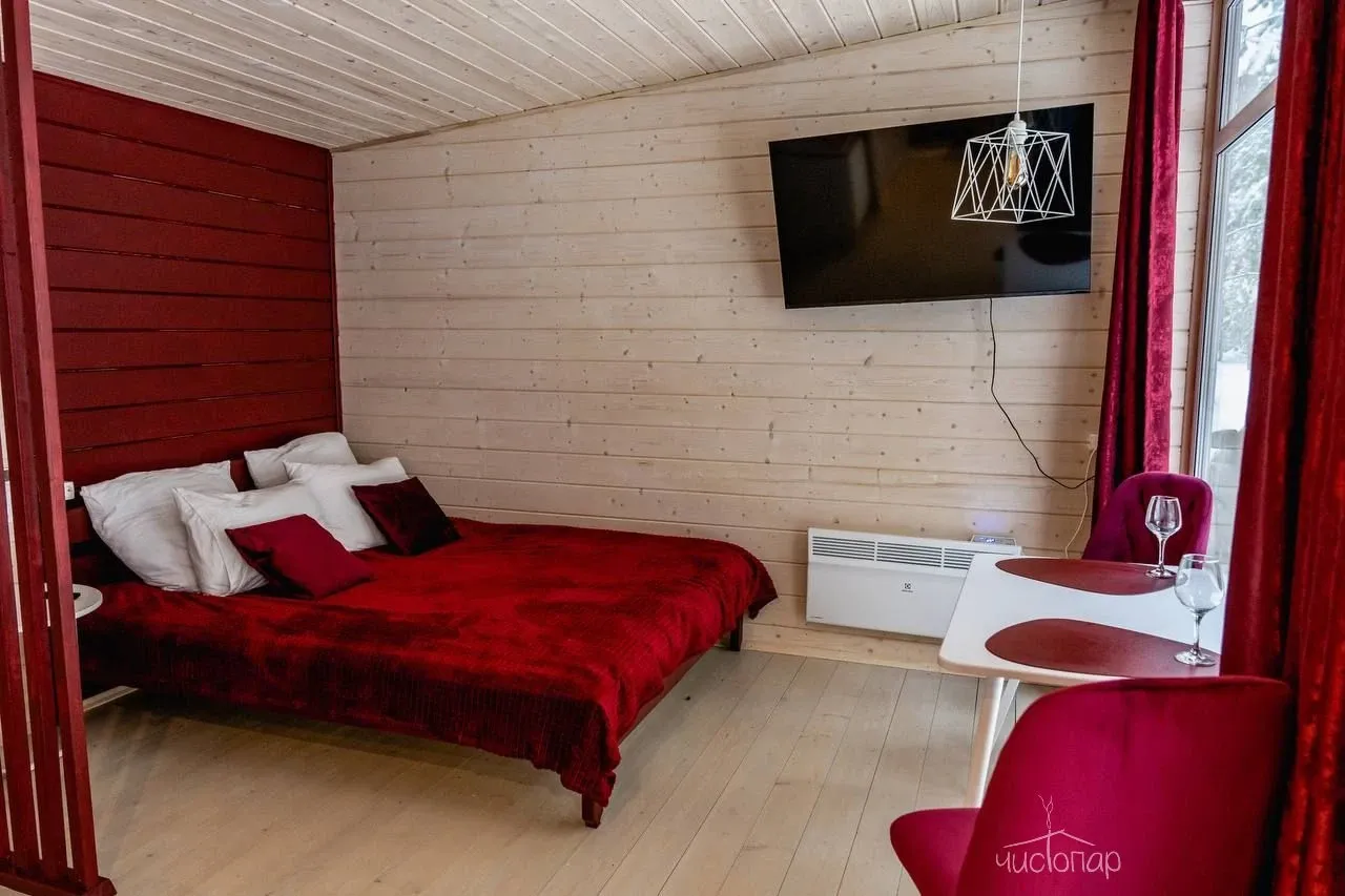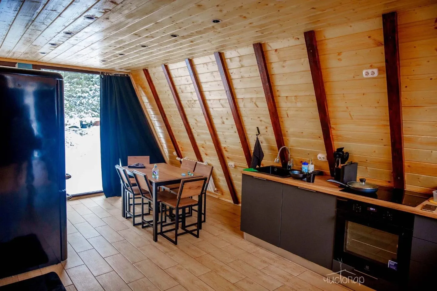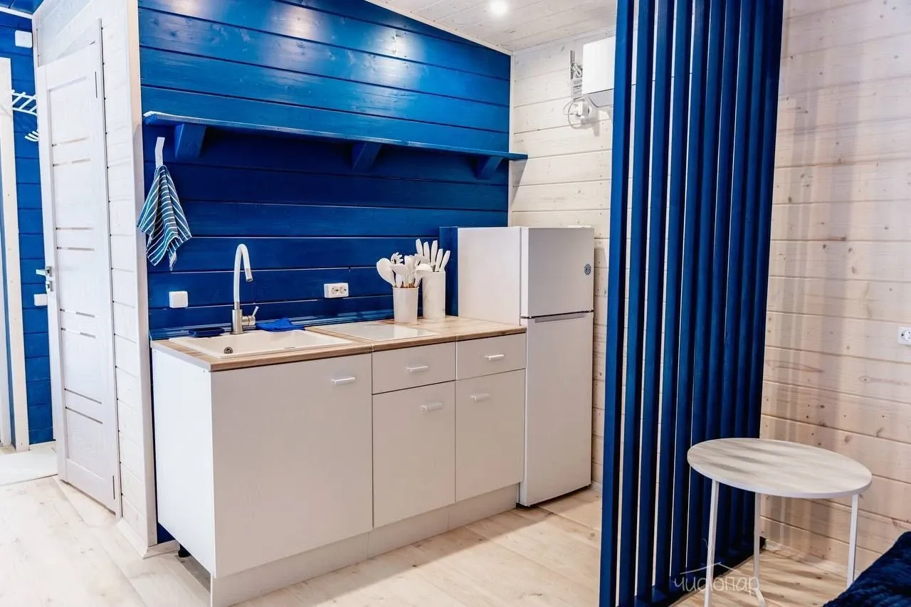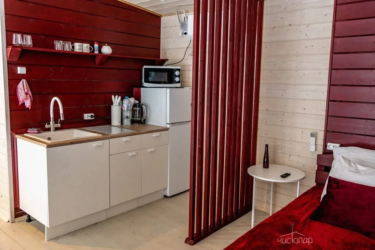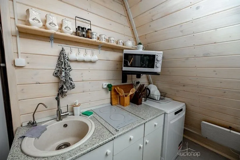 В каждом домике может остановиться до четырех человек. Здесь есть кухонный уголок, душ и туалет. Возле домика — мангал. Жить можно круглый год, для этого есть все необходимое. Есть одно «но»: WI-Fi ловит, а вот телефон — нет.