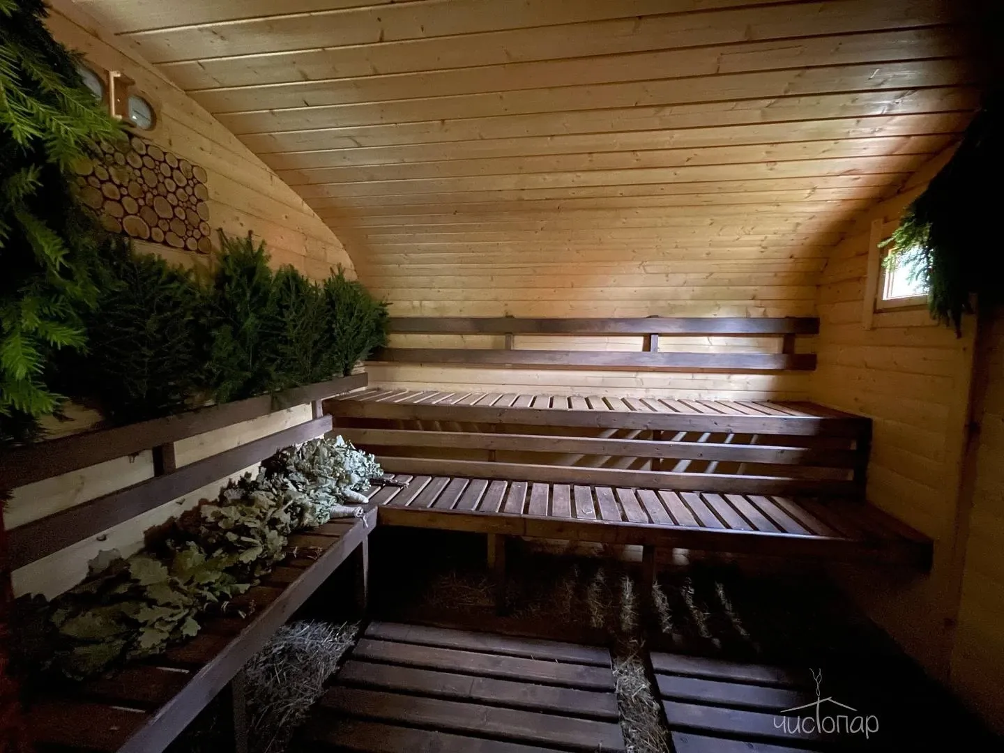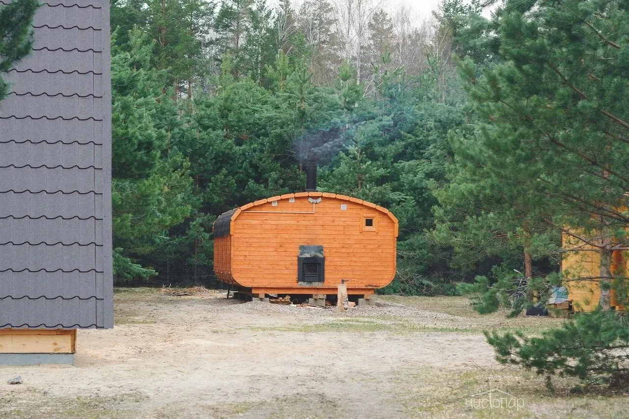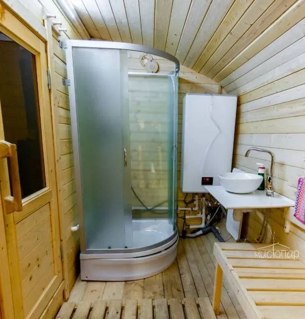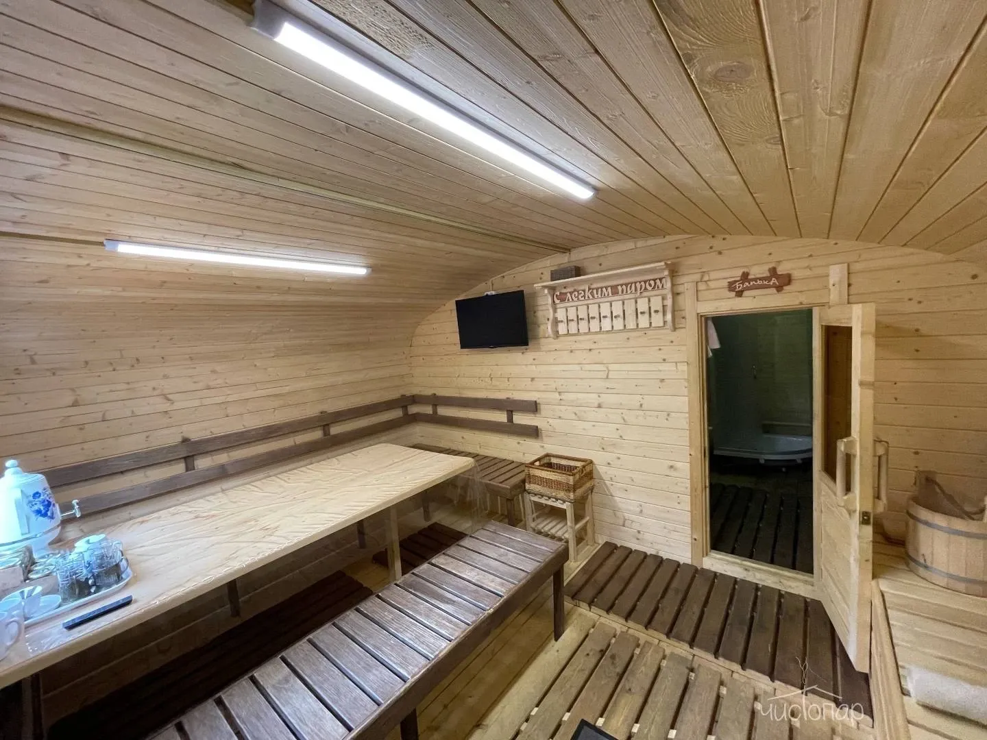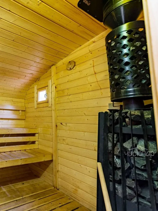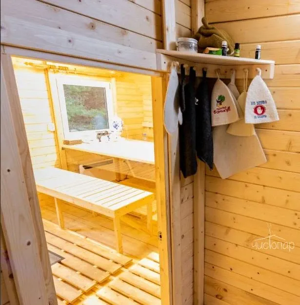 На территории комплекса имеется баня из кедра на дровах с вместительной парной и бочкой на шесть–восемь человек.