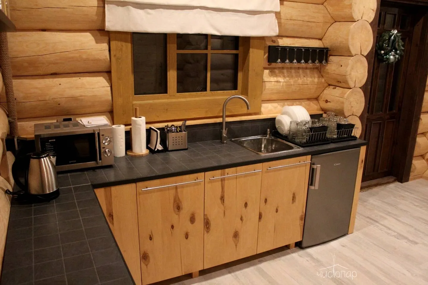 - Обустроенная кухня с холодильником, чайником, СВЧ-печью и посудой;