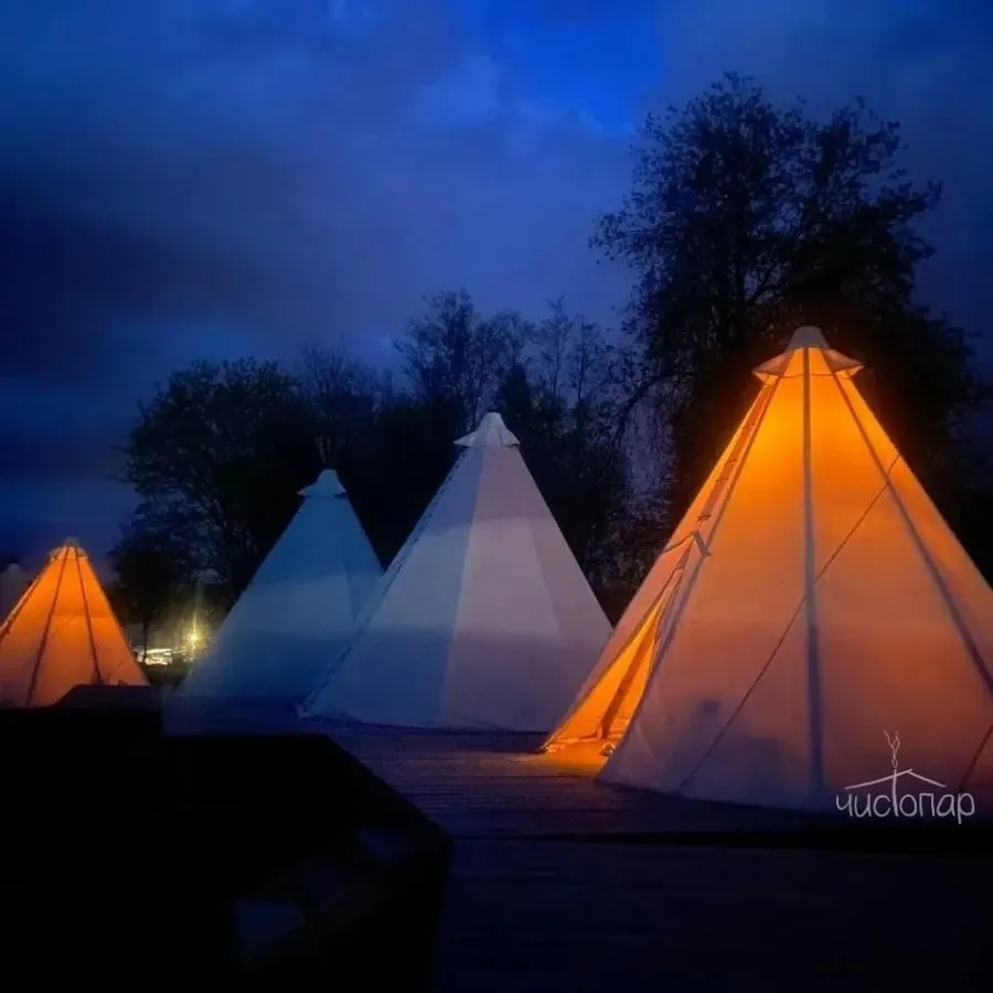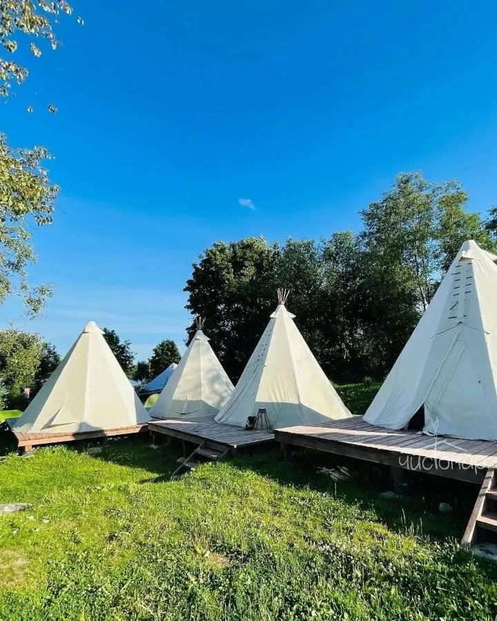 ВигвамКаждый вигвам расположен на своем деревянном помосте. Внутри него мягкий пол (пенка). Вигвам двухслойный, что дает надежную защиту от ветра и дождя. В нем тепло, сухо и комфортно.