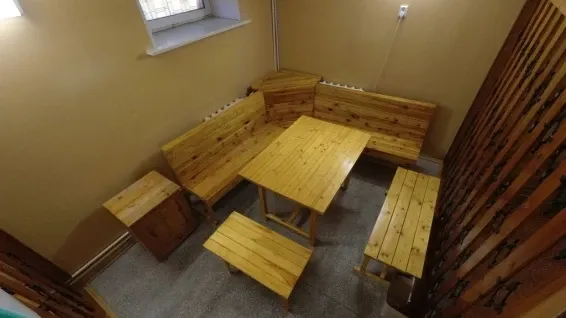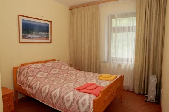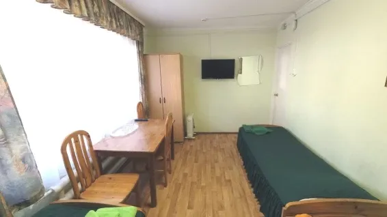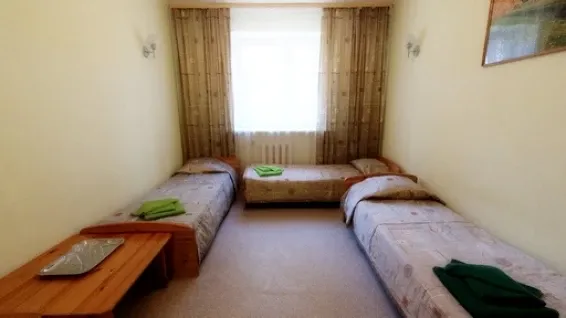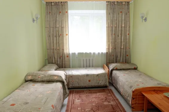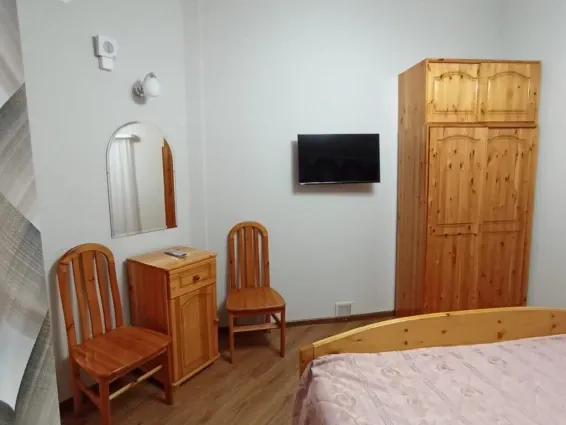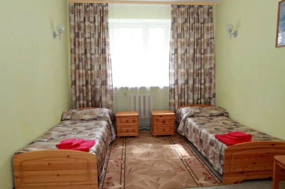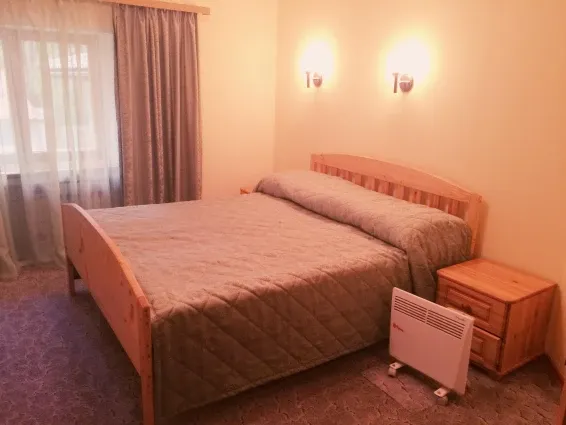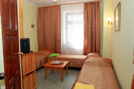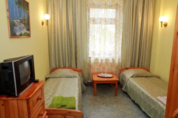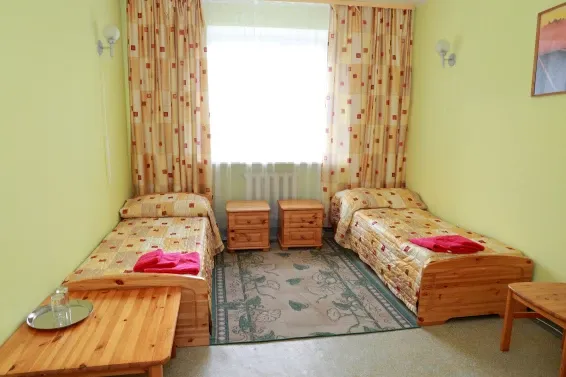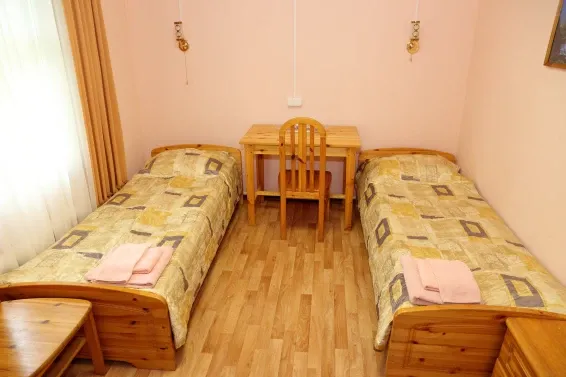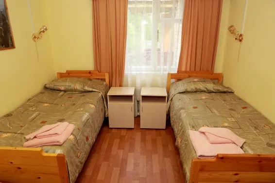 Номера «Стандарт» оборудованы необходимым набором мебели из массива сосны (односпальные кровати, тумбы, шкаф для одежды, стулья, журнальный стол) и телевизором.