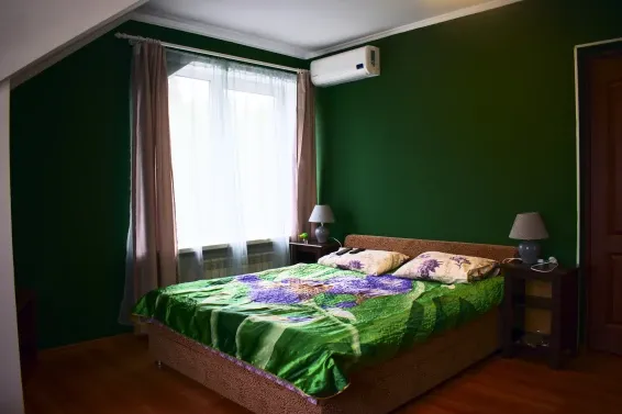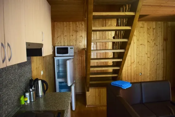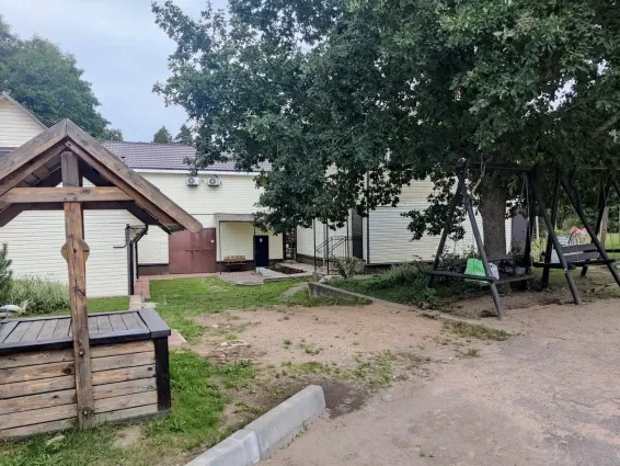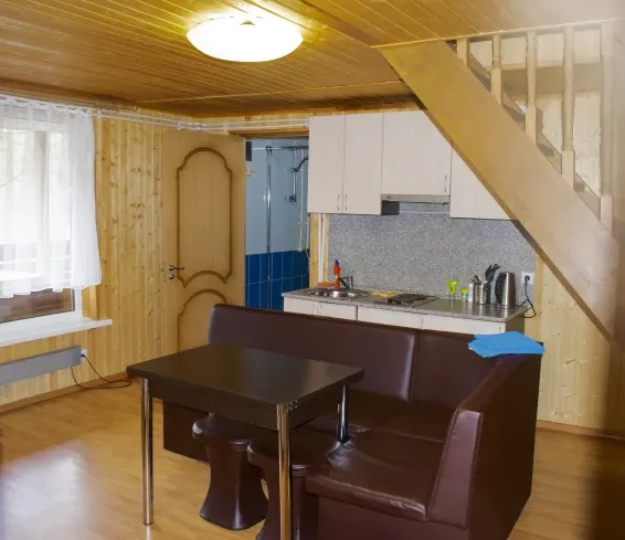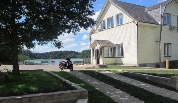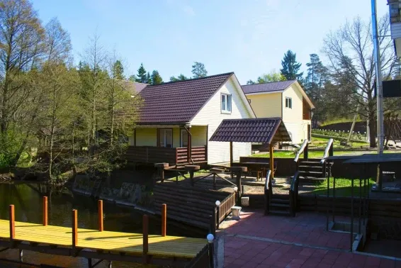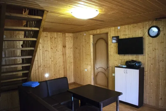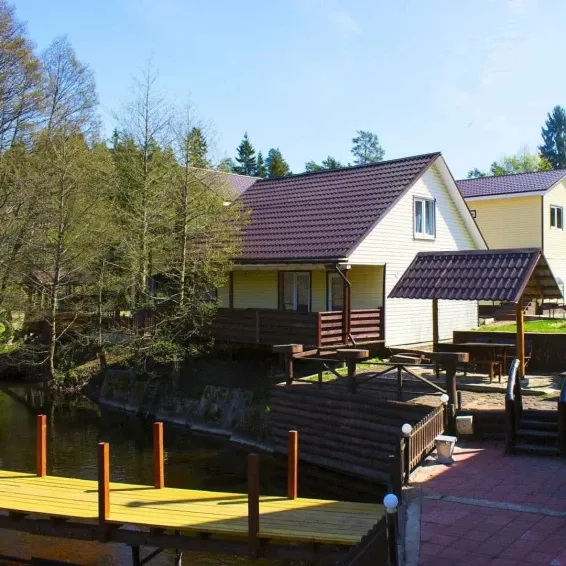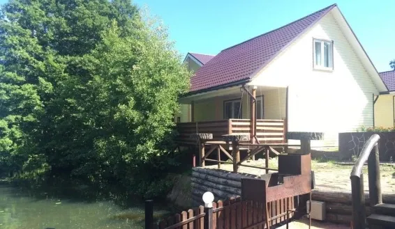Гостевой дом на 6 человек с банейУютный двухэтажный коттедж, в котором с комфортом расположится семья или компания друзей из 4-6 человек. На первом этаже дома разместилась большая кухня-гостиная, где установлены: мягкий диванный уголок со столом, электрическая плита, микроволновая печь и холодильник, электрочайник и набор посуды, широкий ЖК-телевизор и часы. Также в доме на первом этаже найдется русская баня, санузел, душ. На территории дома беседка, мангальная зона, собственный пирс к озеру.