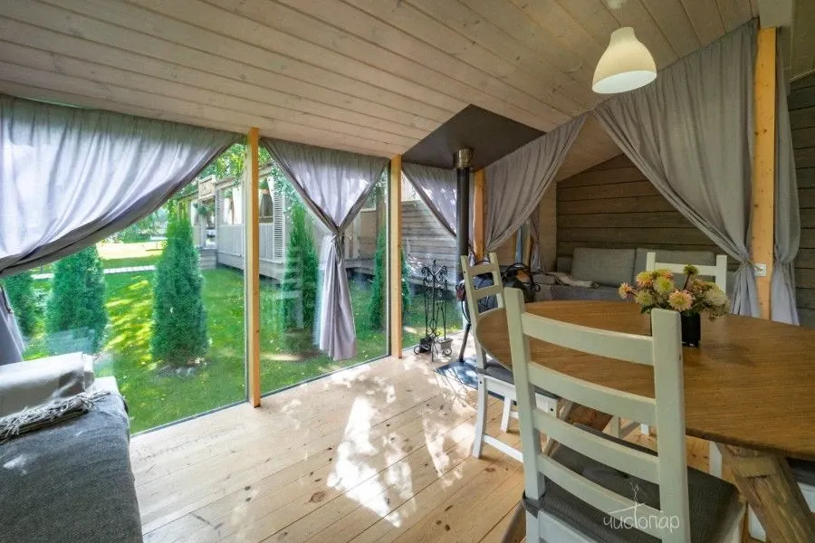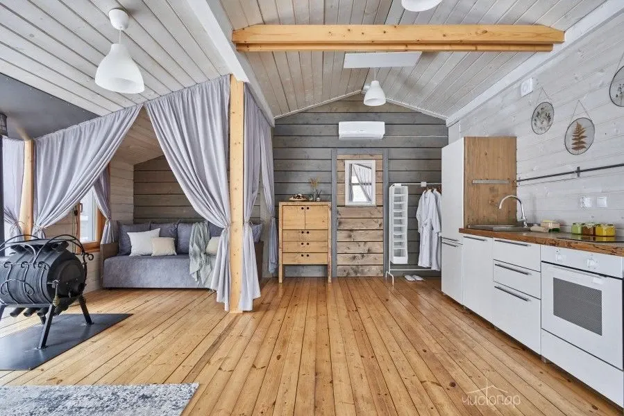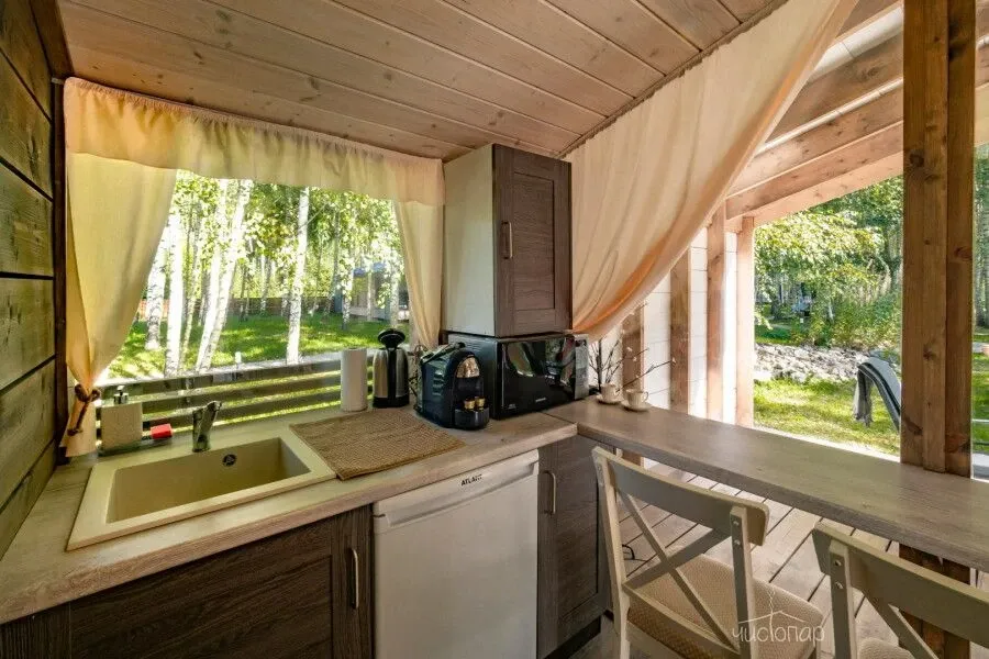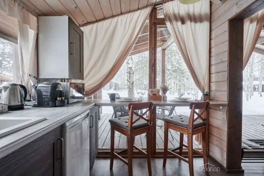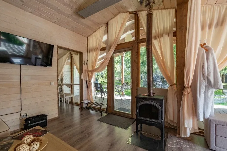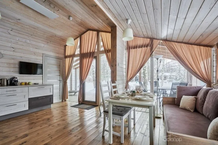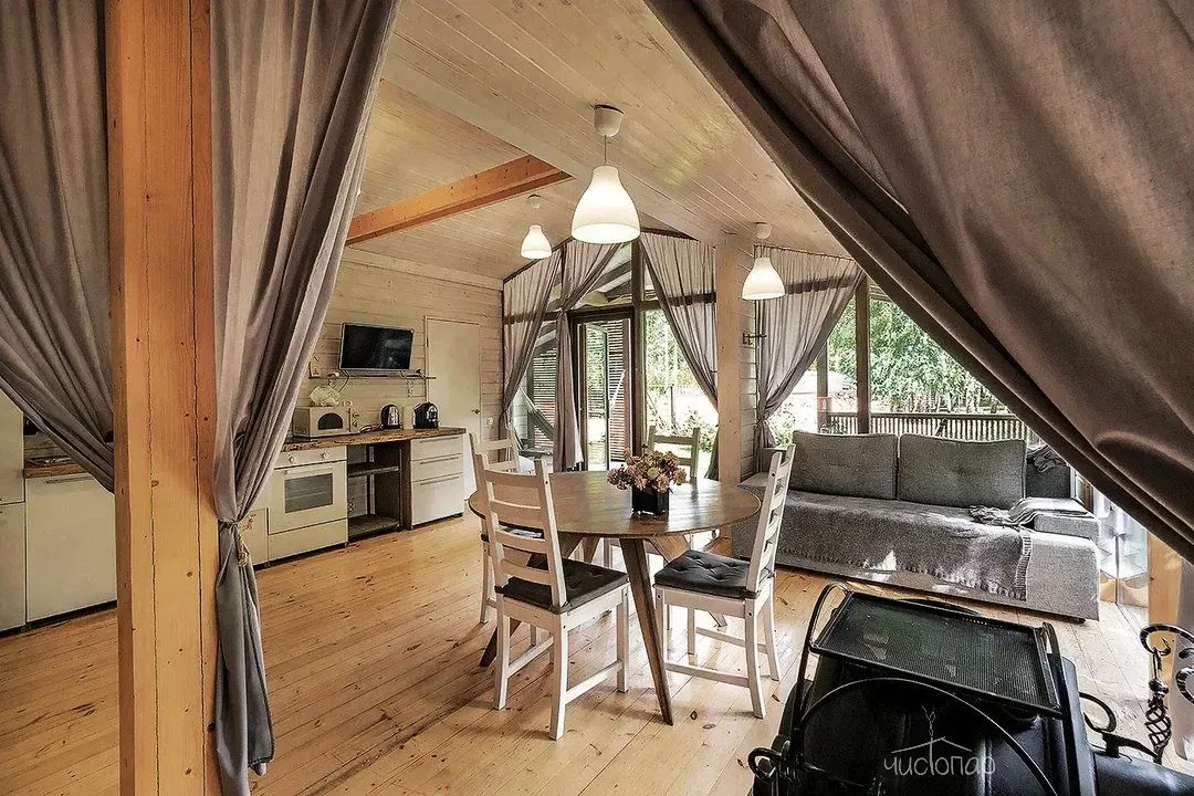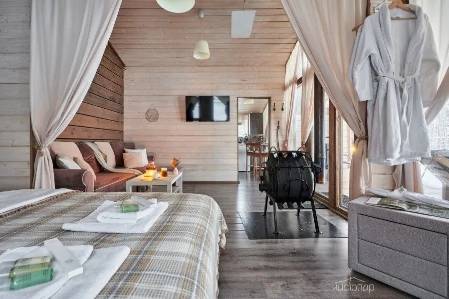 Барнхаус #1 ЛасточкаДом для комфортного семейного отдыха на 4-6 человек. Общая площадь 75 кв.м (24 терраса и 51 кв.м. основная жилая площадь). В распоряжении гостей кухонная зона, душ с тёплыми полами, туалет, отдельная спальня, зал с отделённым ширмой дополнительным спальным местом, печь-камин, система автоматического поддержания температуры, шторы блэкаут.