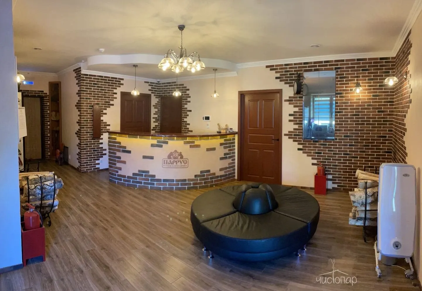 Она спроектирована и построена с заботой о каждом посетителе бани. Главная гордость - это настоящие русские печи в парных, выложенные специально приглашенным, мудрым и опытным специалистом. Парная отделана экологически чистой, необрезной доской липы, каждая доска обработана вручную. Отделка помещений выполнена из экологически чистого леса, специально привезенного из Калужской и Брянской областей.