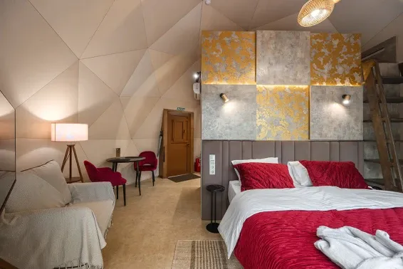 Домик ДелюксВидовой четырехместный домик с роскошным интерьером.