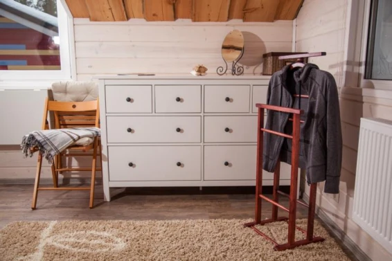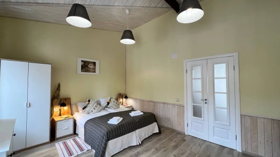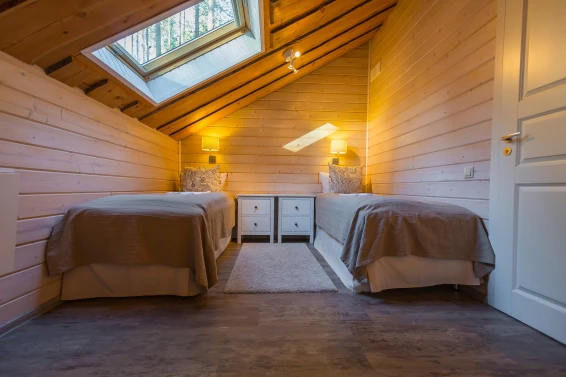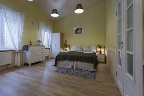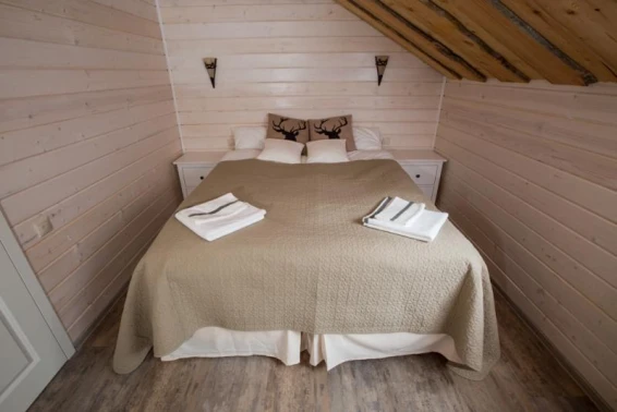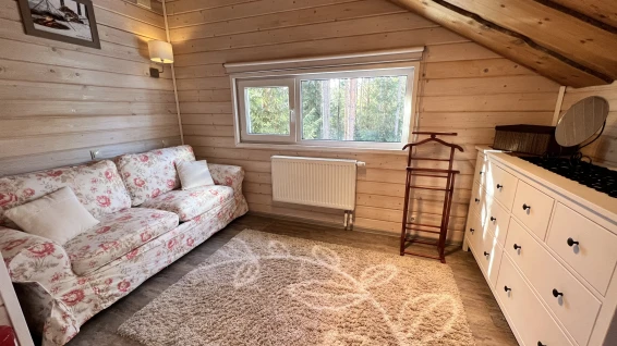 На втором этаже расположены две комфортабельные комнаты. В каждой из них предусмотрена большая двуспальная кровать, которую, при желании гостей, легко можно трансформировать в две односпальные. У окна располагается удобный диван, который так же трансформируется в двуспальную кровать.