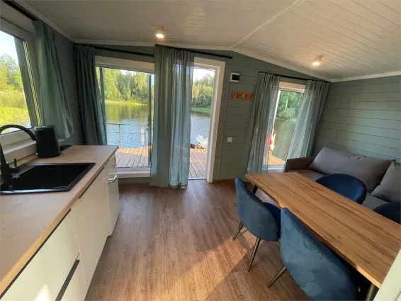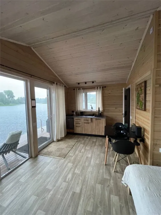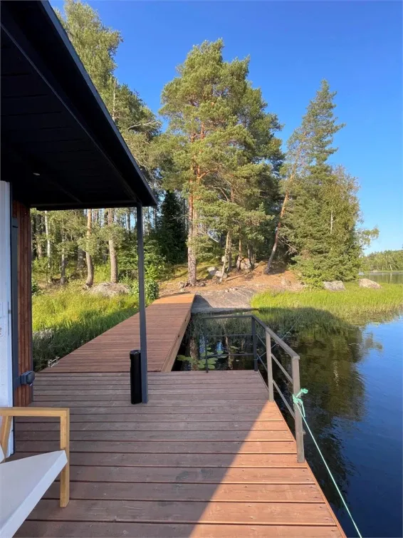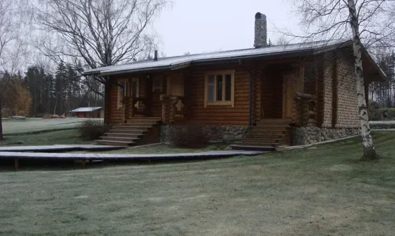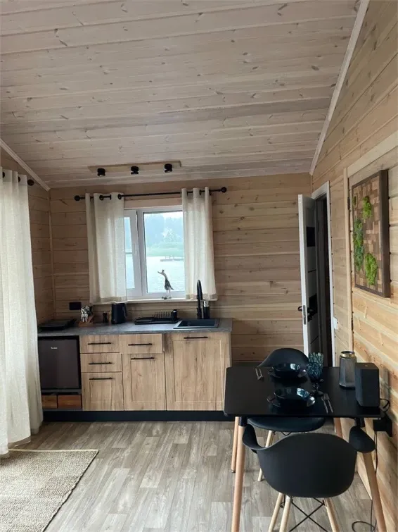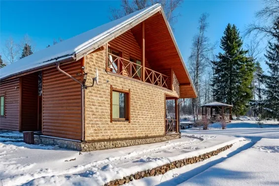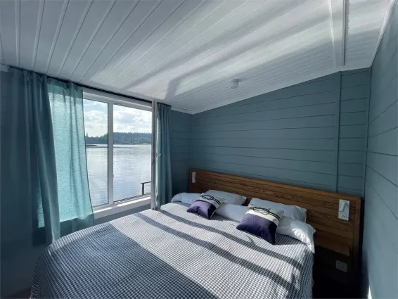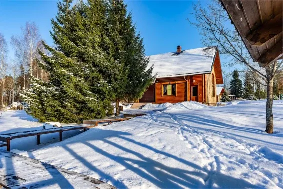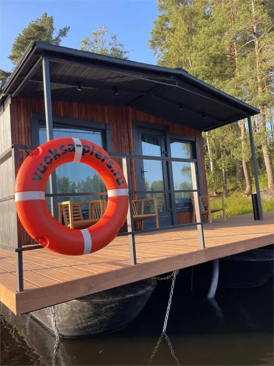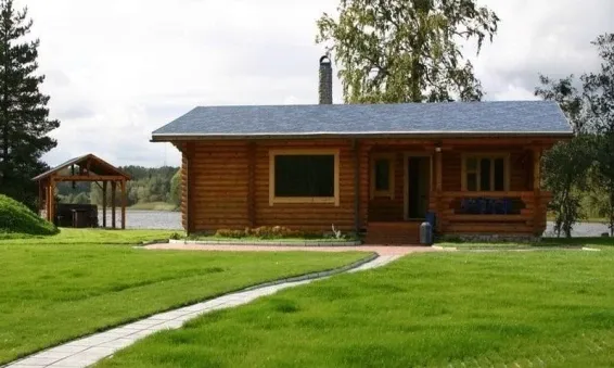 Этот одноэтажный коттедж на берегу Вуоксы подойдет любителям скандинавского стиля. Он очень уютный и компактный – всего 70 кв. м. Здесь хорошо проводить время вдвоем или небольшой компанией - от 4 до 6 человек. В коттедже две спальни (одна с большой кроватью, вторая - с двумя односпальными), гостиная с кирпичным камином, телевизором и мягкой мебелью, кухня с необходимой посудой и техникой, финская сауна. На территории возле домика, ближе к реке, установлена беседка с мангалом.