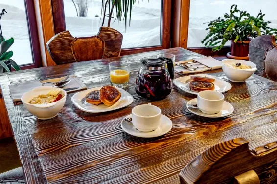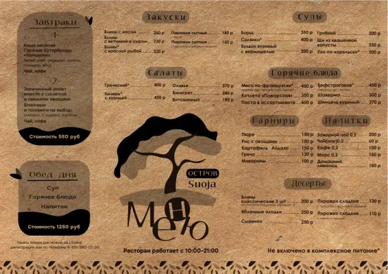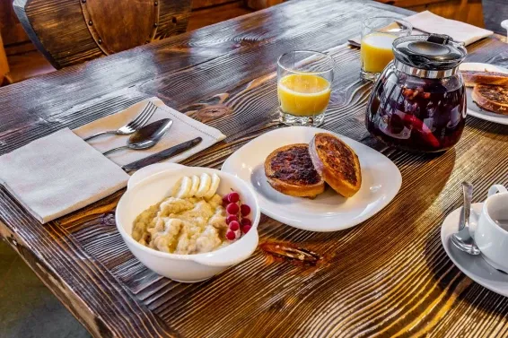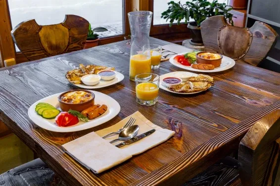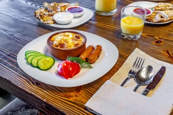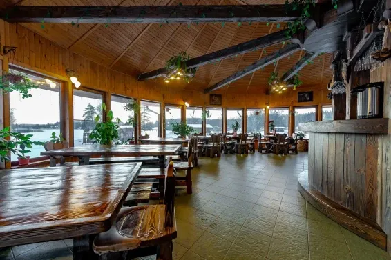 В клубе работает панорамный ресторан, из окон которого открывается захватывающий вид на Вуоксу. Здесь гости могут насладиться завтраком в утренние часы, а с 14:00 начать дегустировать блюда из меню, приготовленные с любовью и вниманием к деталям.