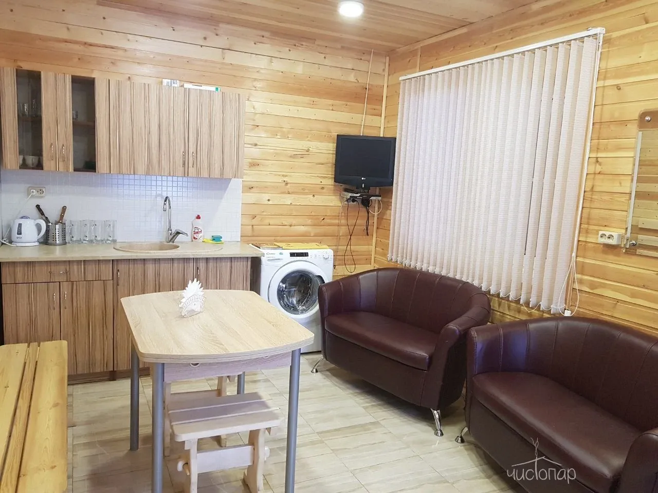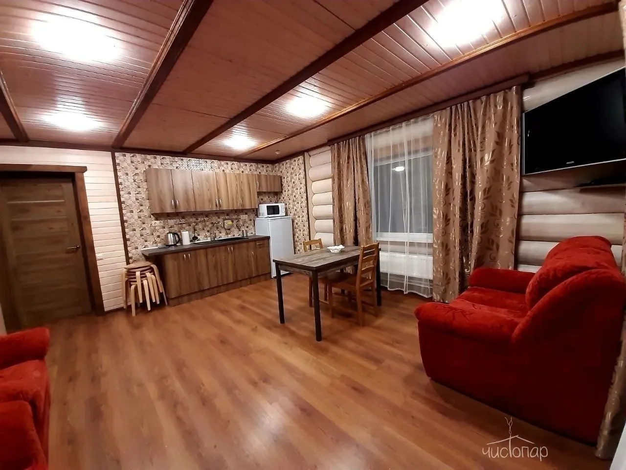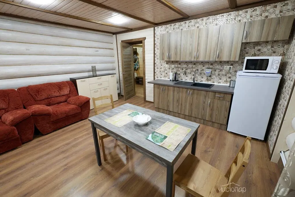• Гостиная с раскладным диваном, мини-кухней (холодильник, микроволновка, электрический чайник), столом и спутниковым TV.