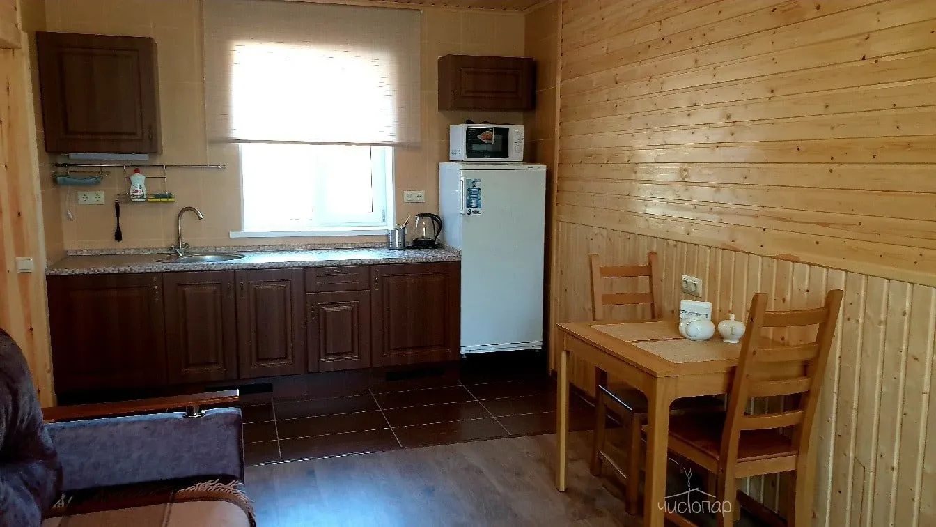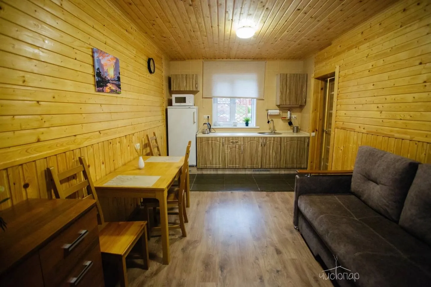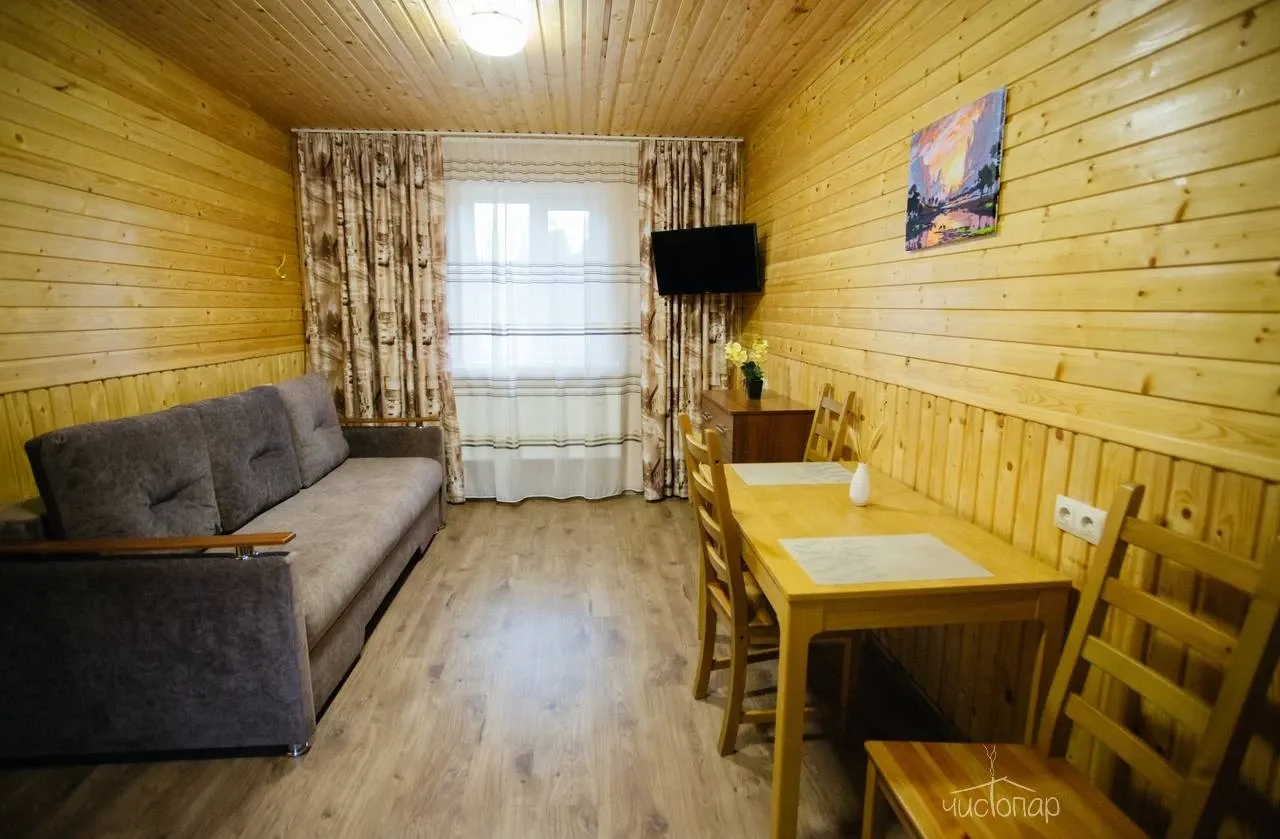 • Гостиная с раскладным диваном, мини-кухней (холодильник, микроволновка, электрический чайник), столом и спутниковым TV.
