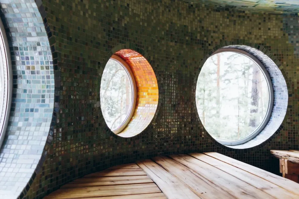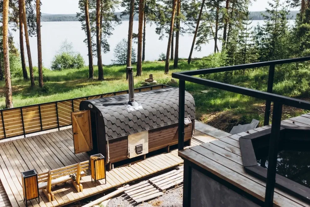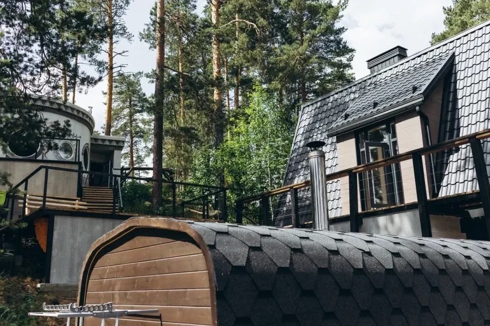 Авторская круглая баня с мозаикой стихий, команда чемпионов по банному мастерству, полное уединение в реликтовом сосновом лесу у озера.