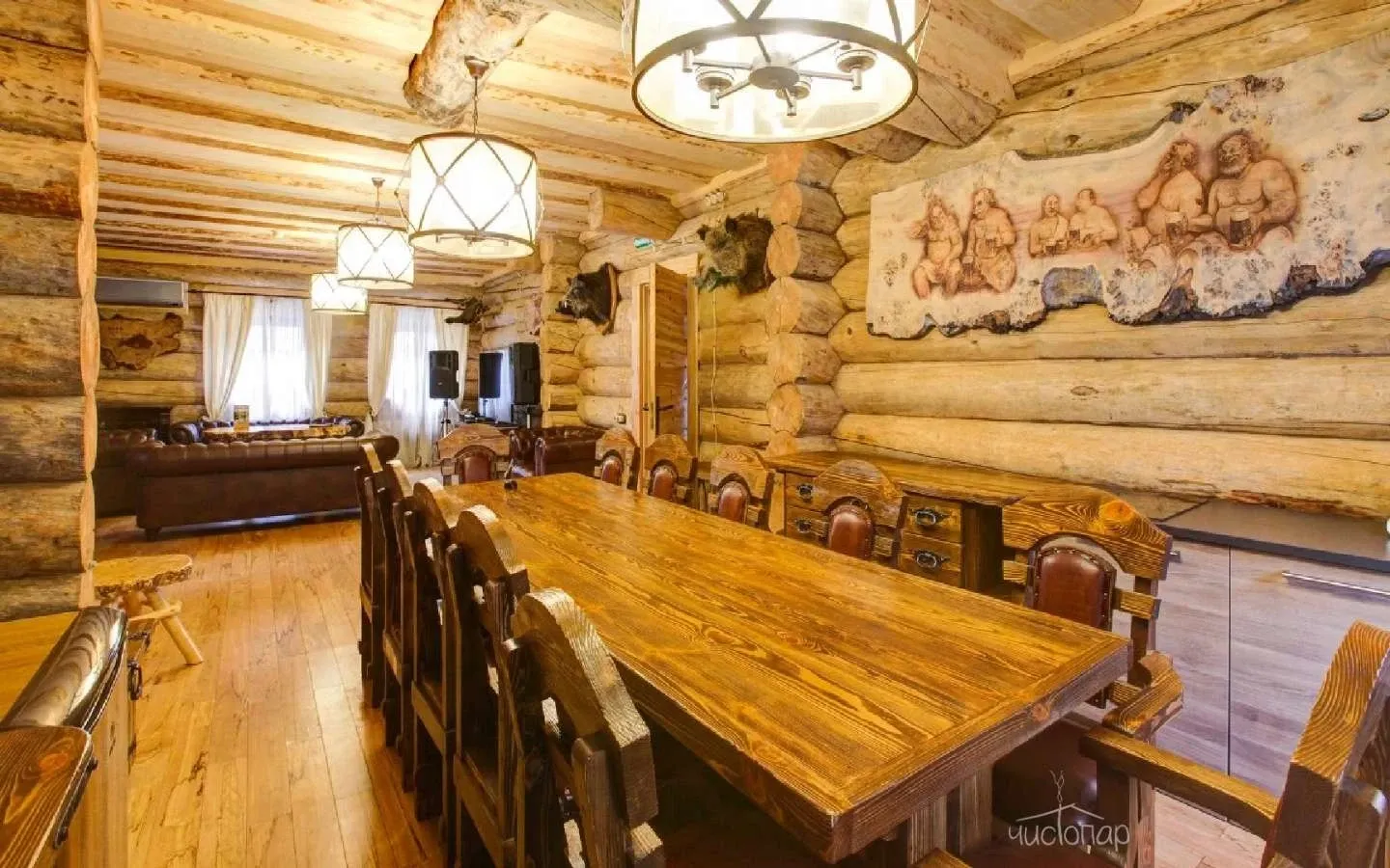 Качественная ТВ-система, караоке, бильярдные для компаний до 17 человек. 3 комнаты отдыха в каждом тереме. Аминьевские бани – это весомый повод встречаться чаще.