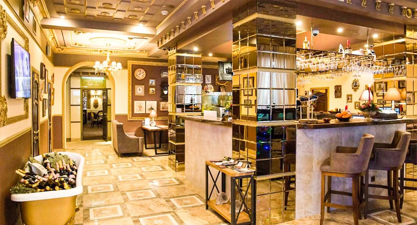 Апартаменты "Фьюжн"Апартаменты выполнены в стиле фьюжн. Здесь вы увидите слияние современного стиля с нотками арт-деко. Вас радушно встретит и удивит динамикой своих диагональных линий гостиная — в обоях, в 6-угольной форме плитки, плавно переходящей в диагональные линии 6-угольных зеркал, которые как бы перетекают в поверхность потолка. Также поразит сочетание глянцевых и матовых поверхностей мебели, декора. Творческие натуры по достоинству оценят футуристические светильники-подвесы, которые будут радовать глаз своими 3D эффектными вспышками салютов. Гостиная оборудована музыкальным центром, караоке, спутниковым ТВ, Wi-Fi. Гостям будет удобно расположиться на диванной группе, которая состоит из современного дивана, стола и классических кресел. Комната отдыха очарует и будет манить вас своим мерцающим светом и мягкими фактурами мебели и текстиля.