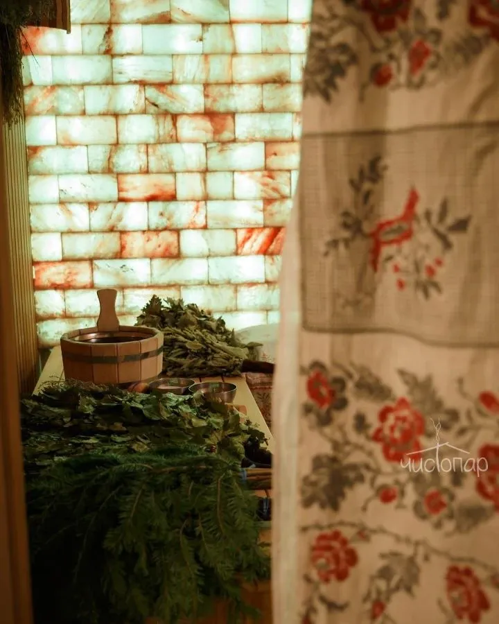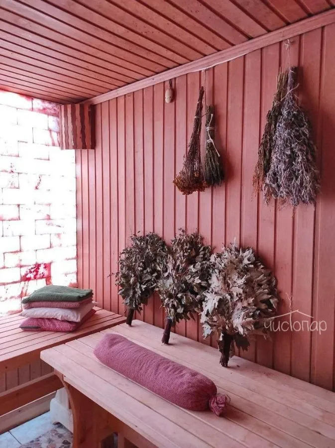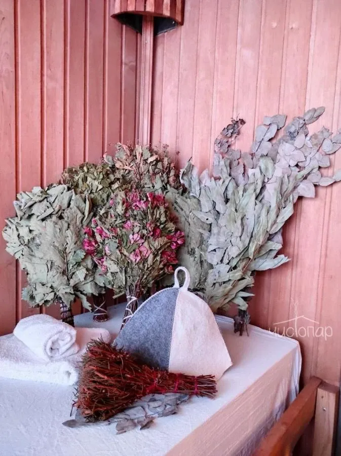Каждый заход в парную мы подвешиваем новые ароматные травы, после прогрева проливаем гостей теплой водой, смывая токсины и мягко освежаем после парения.