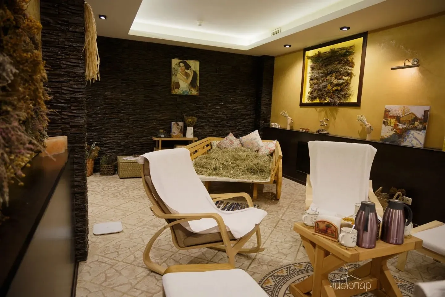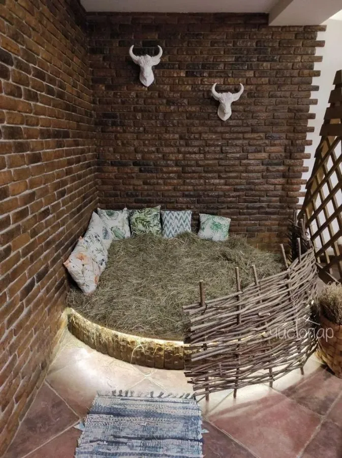 В комнате отдыха гости найдут небольшой сеновал на котором можно отдохнуть, погрузившись в атмосферу деревенского быта.