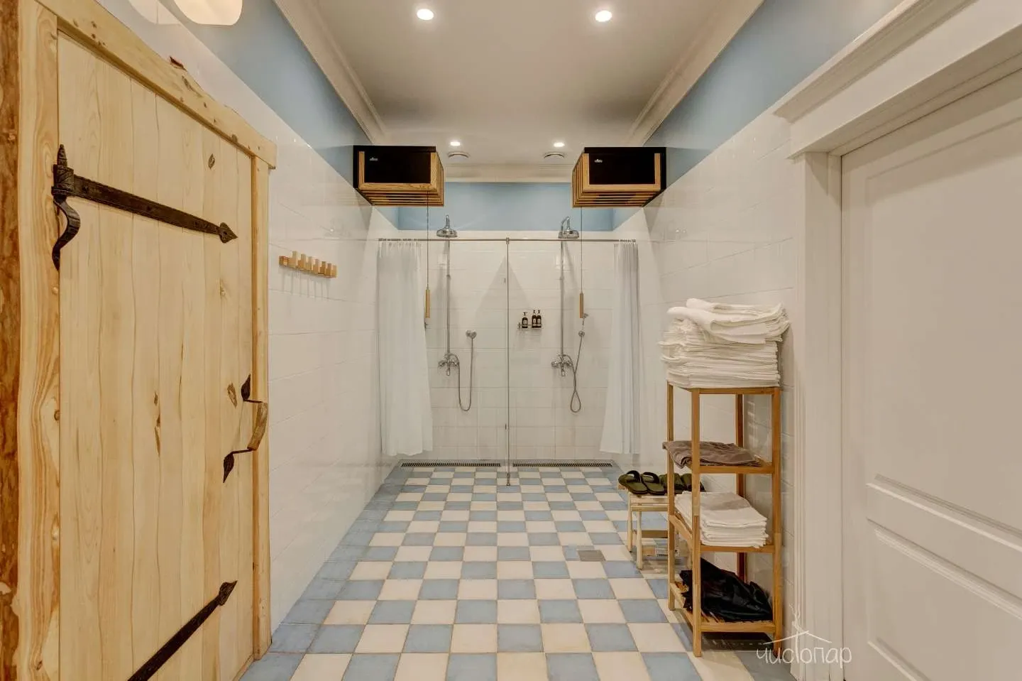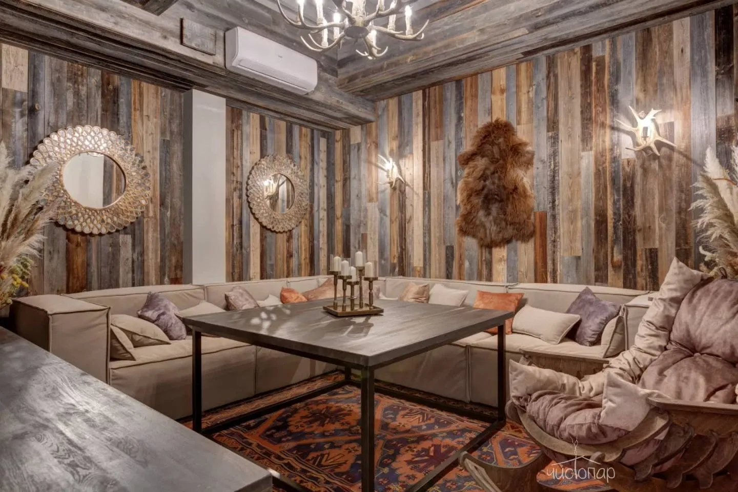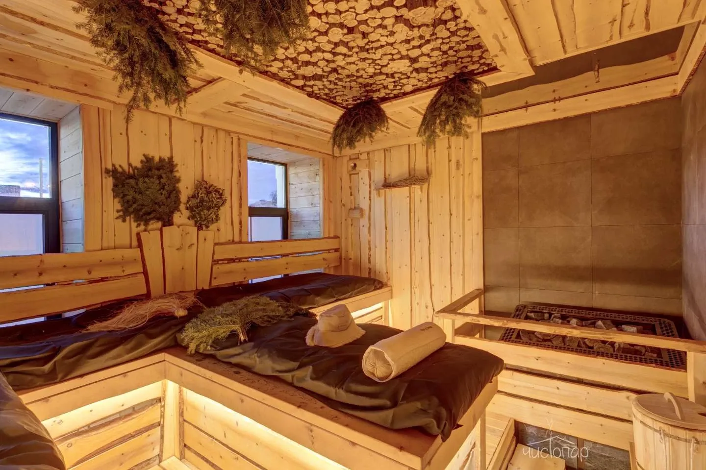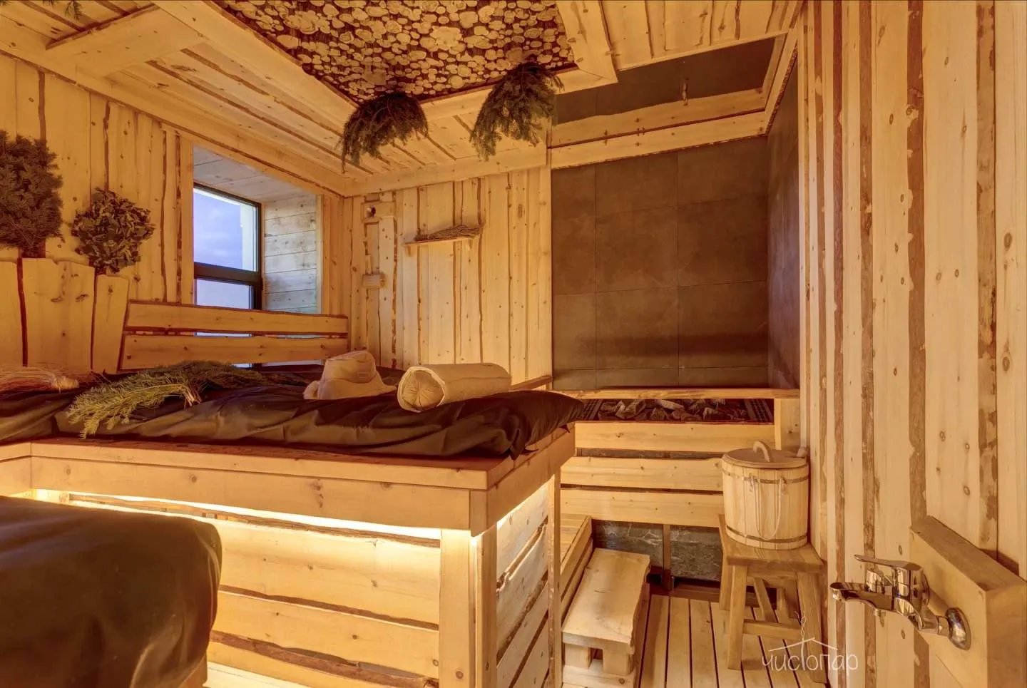 ШалеЭто – наш самый просторный банный номер, который воссоздает традиционный деревянный домик в горах. Атмосферу пасторального отдыха поддерживают деревянная отделка, электрический камин и большие окна.