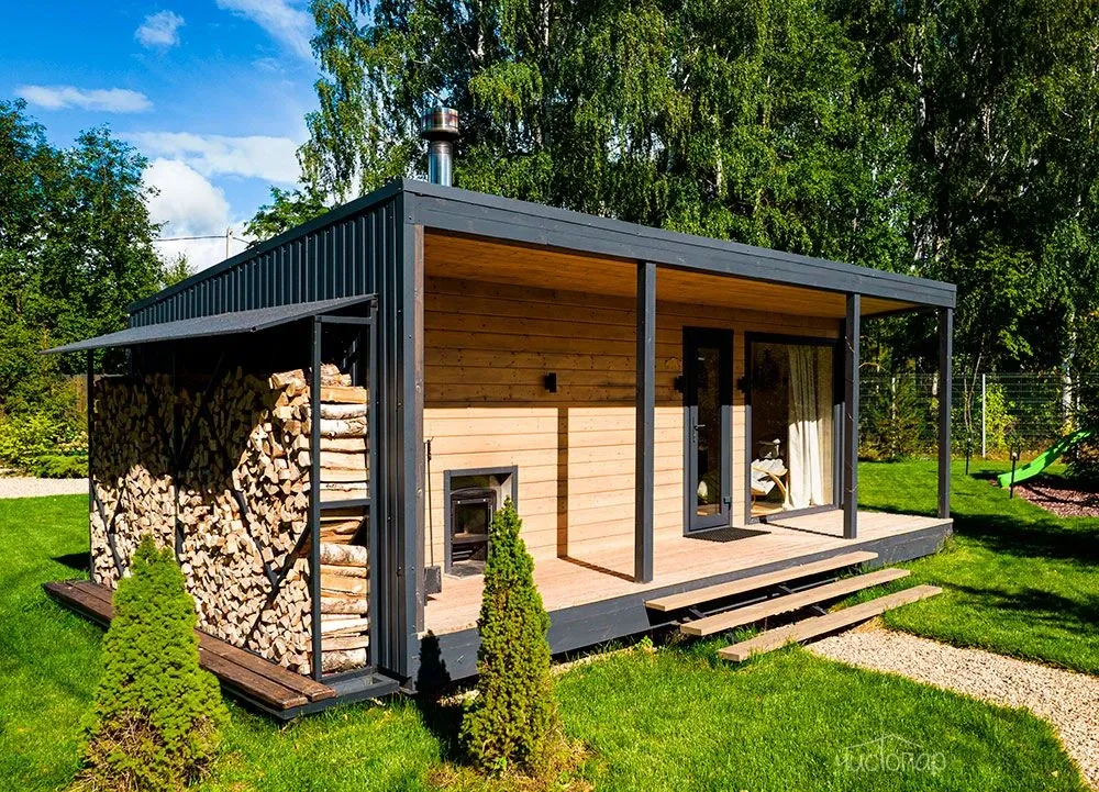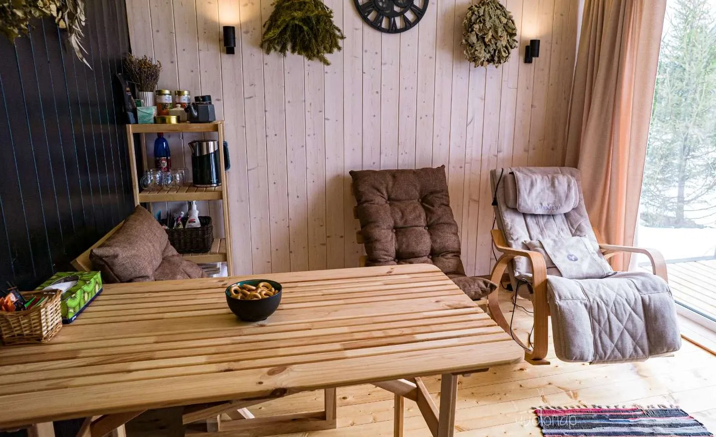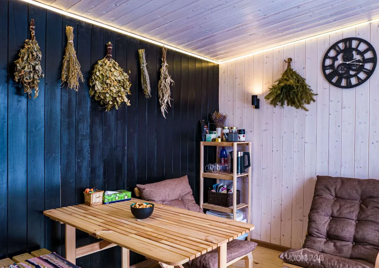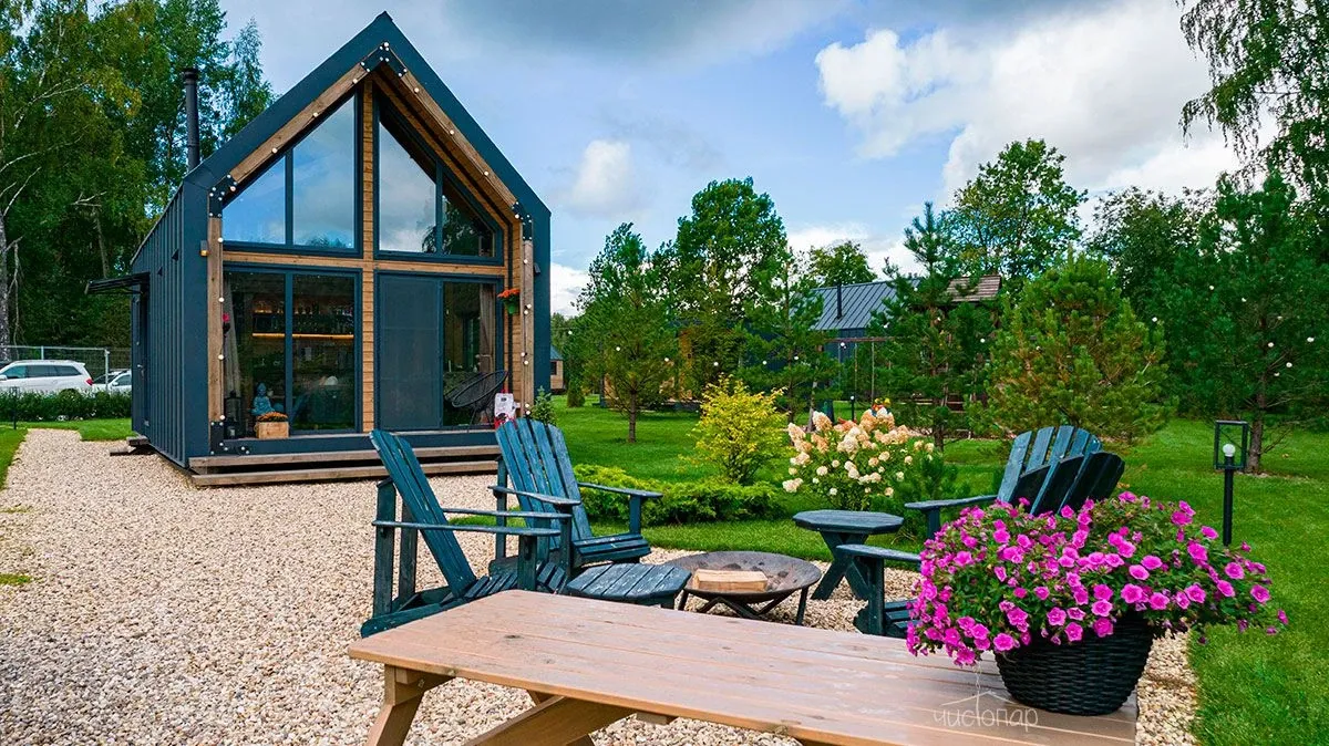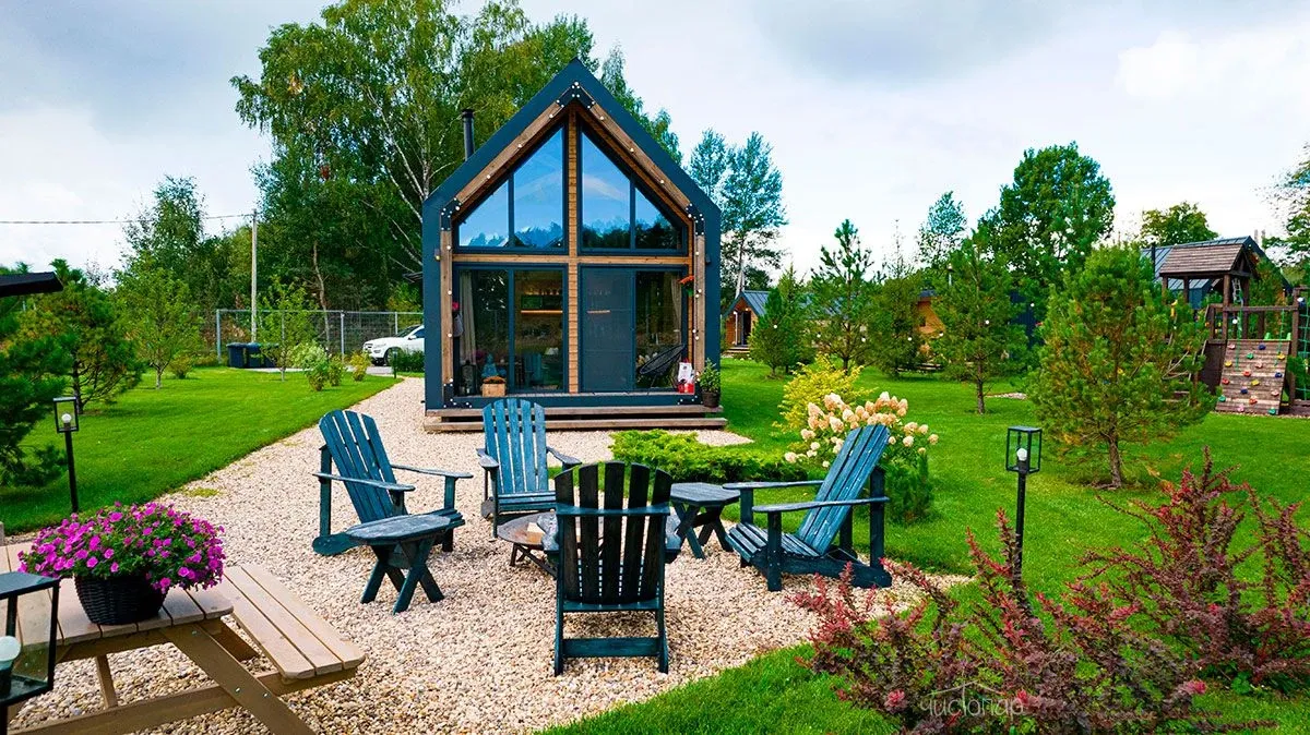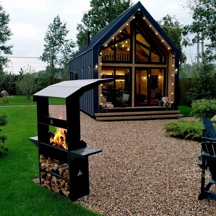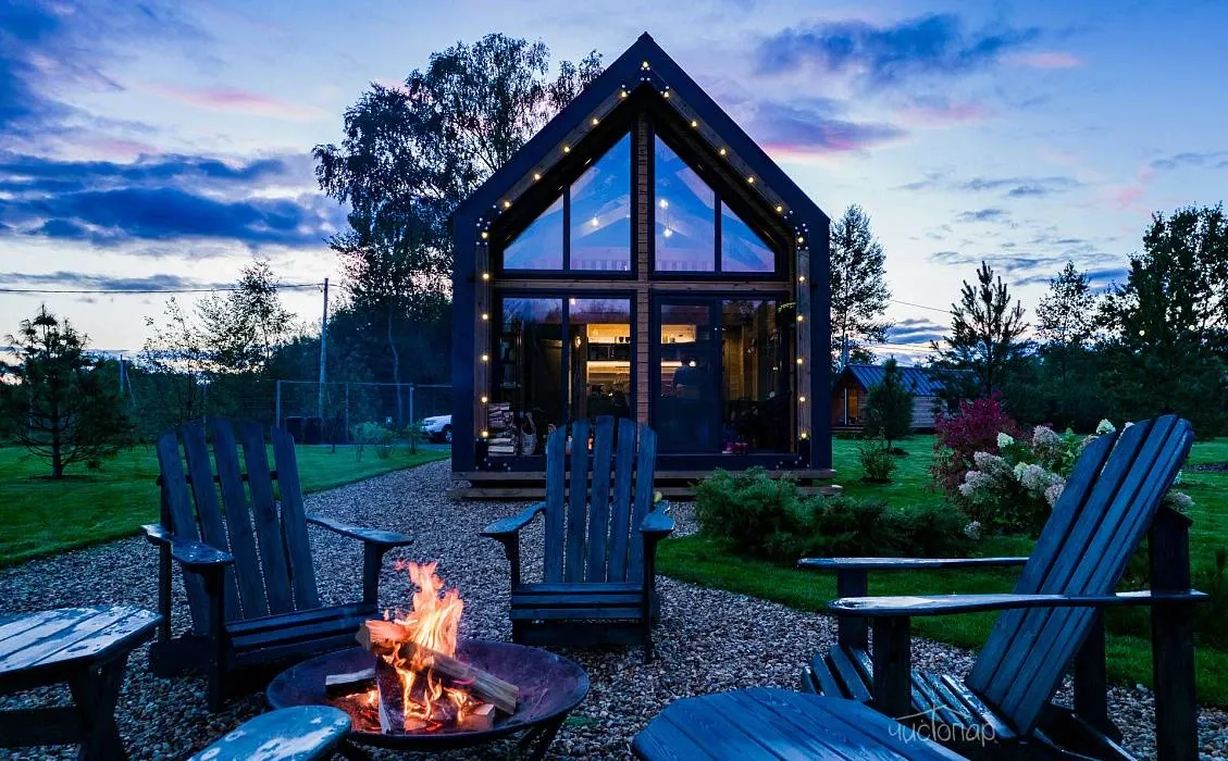У каждого домика своя приватная зона отдыха с мангалом, костровой чашей, удобными креслами и столиками.