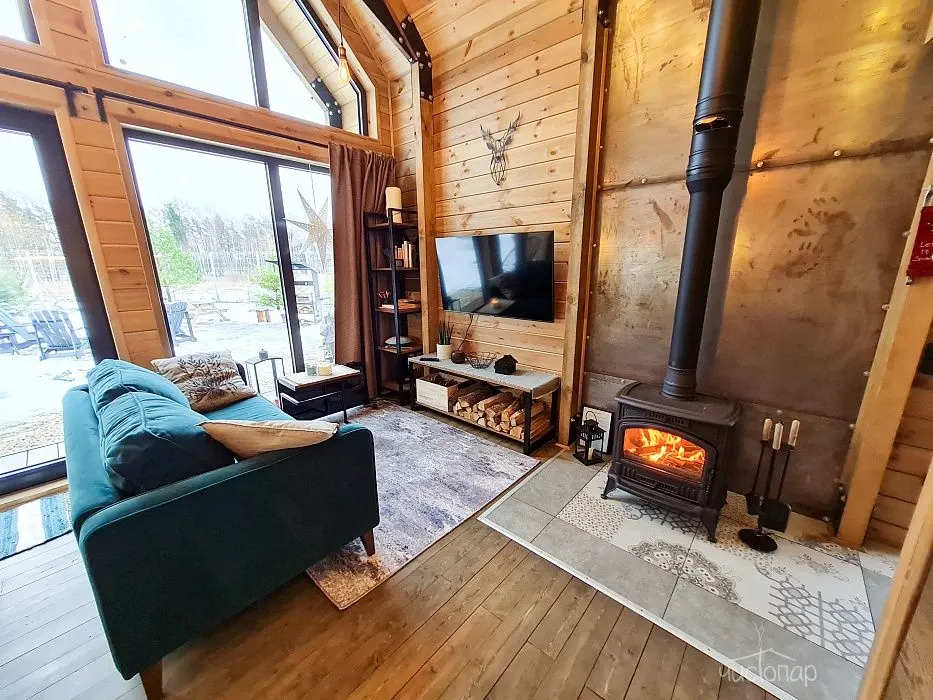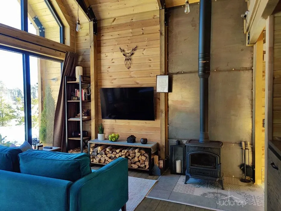 На первом этаже зона гостиной с панорамными окнами, объединённая с обеденной зоной и кухней. Здесь есть печь-камин, стеллаж с книгами, журналами, настольными играми, муз. колонкой и телевизор с системой Смарт ТВ, Netflix, Окко.