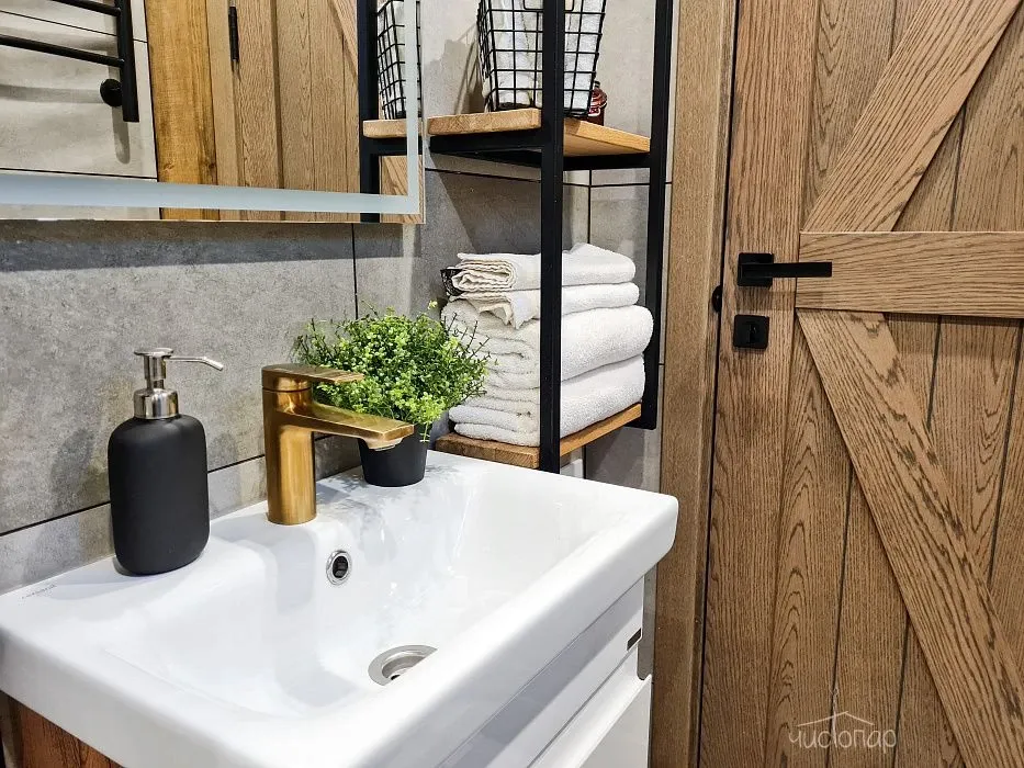 Также на первом этаже расположен санузел с душевой кабиной и необходимыми ванными принадлежностями и спальня с двуспальной кроватью 160х200.