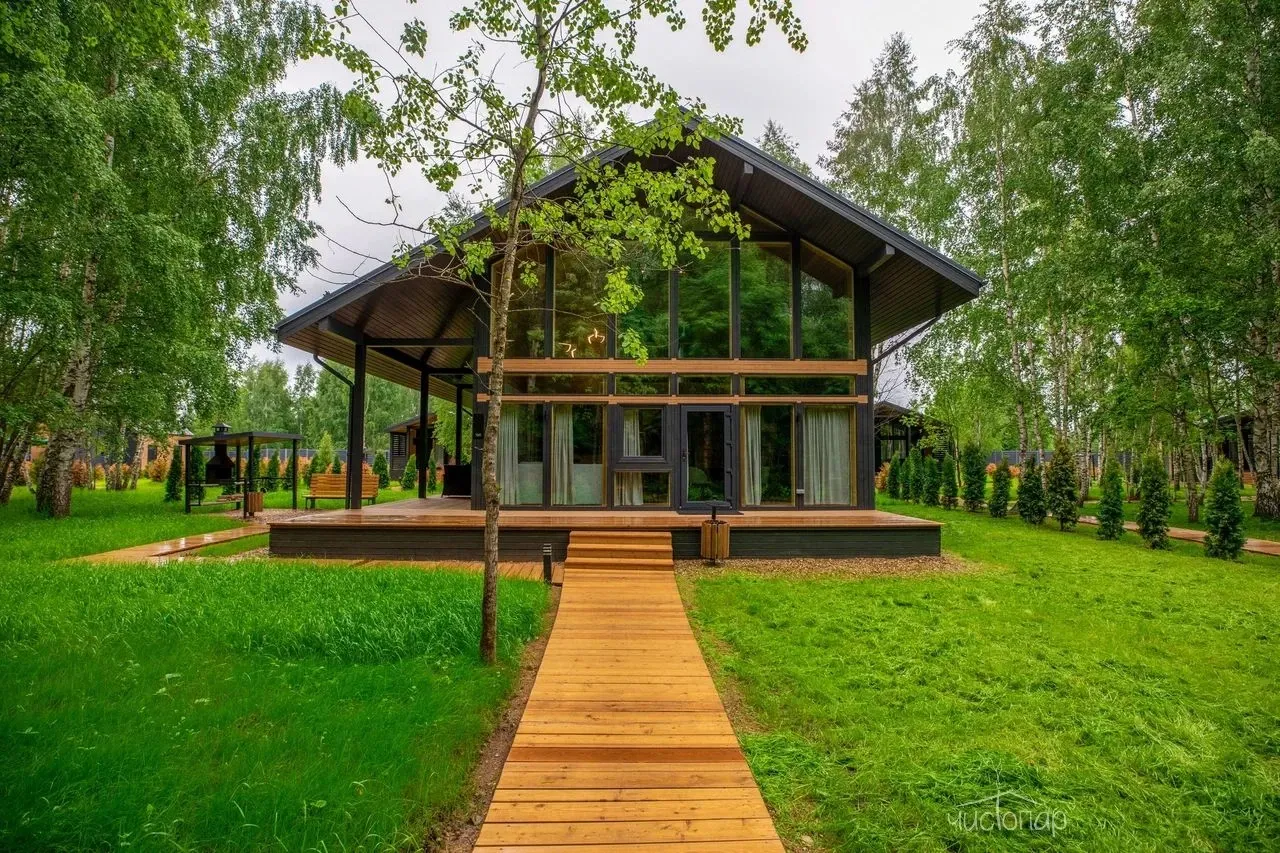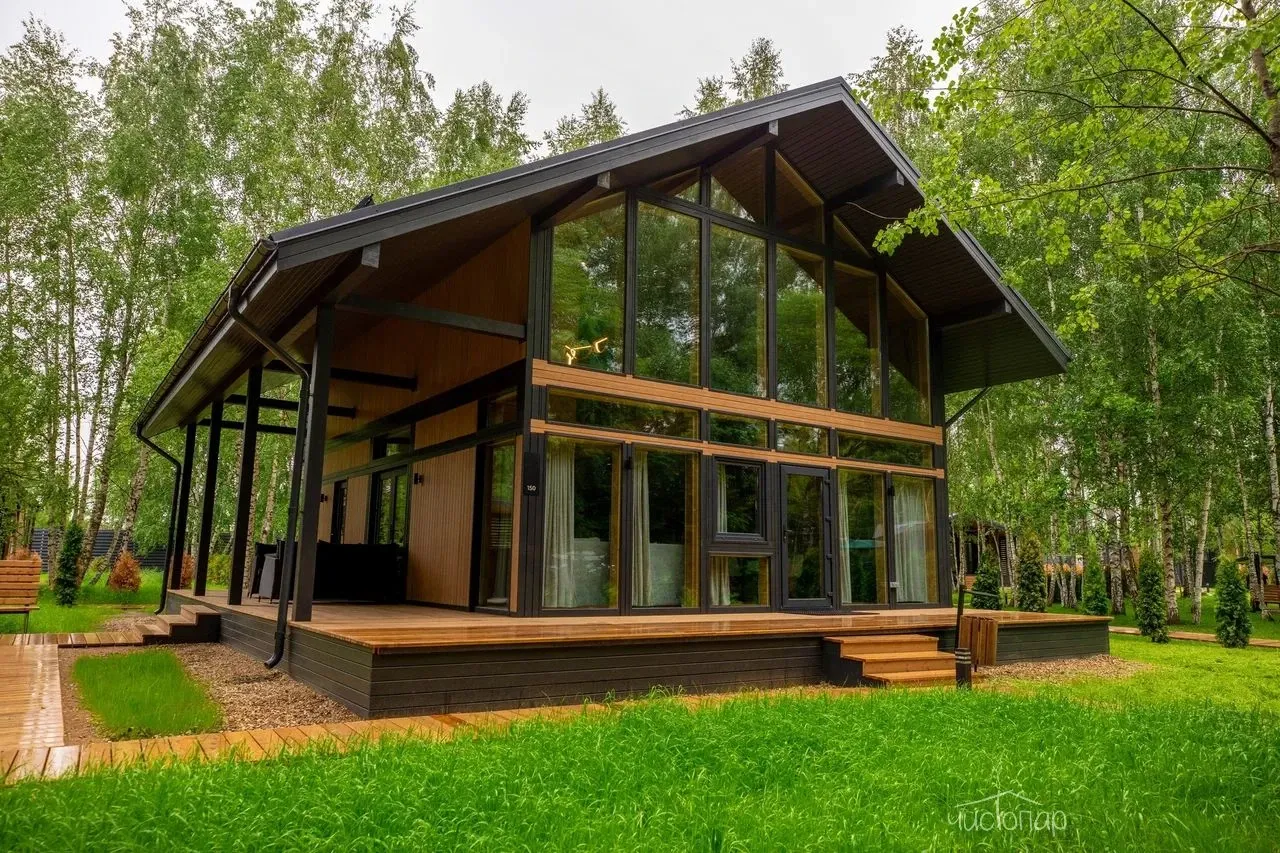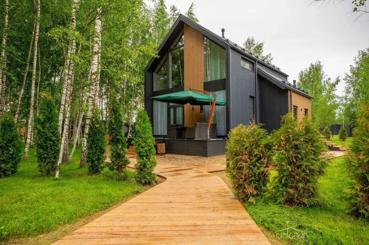 Коттедж 150 кв.м. до 6-ти человекБольшим семейством или с компанией друзей можно комфортно разместиться на двух этажах этого дома. Каркас, облицовка стен и фасада коттеджа выполнена полностью из натуральных материалов. Благодаря огромным панорамным окнам в помещениях много солнечного света, даже в пасмурную погоду в комнатах всегда светло. Из окон открывается прекрасный вид на березовый лес.