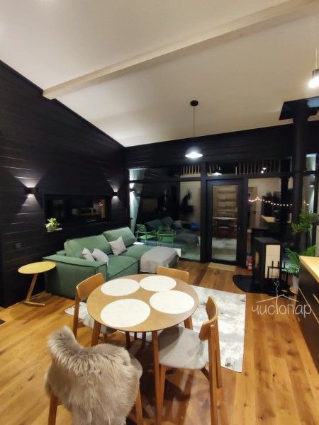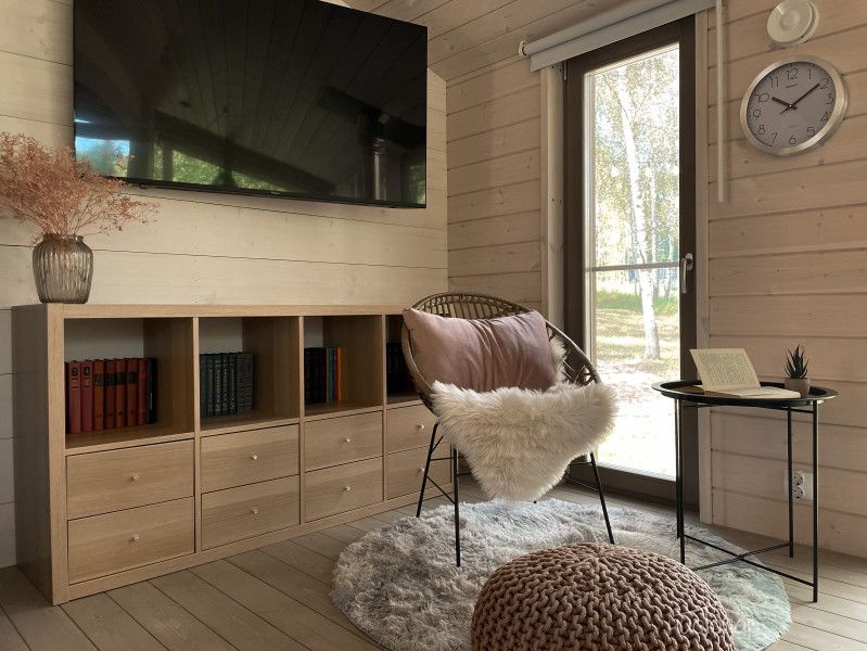 Для вечеров, когда вдруг хочется спрятаться под пледом, в доме есть все необходимое: дровяной камин, телевизор, штопор и бокалы для вина. А для наполнения теплом не только души, но и тела – сауна с панорамным остеклением.