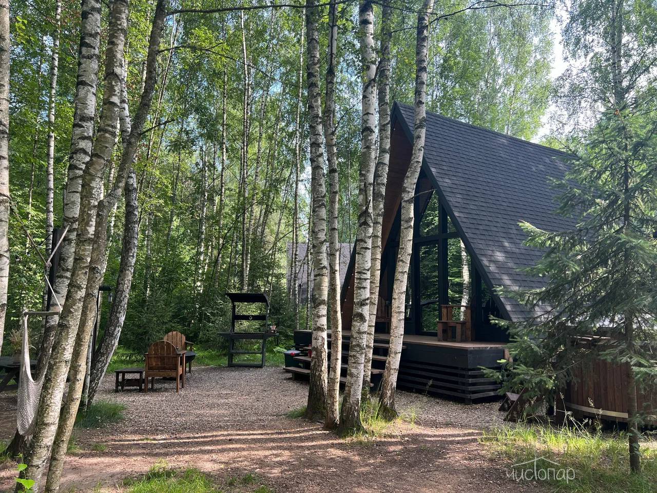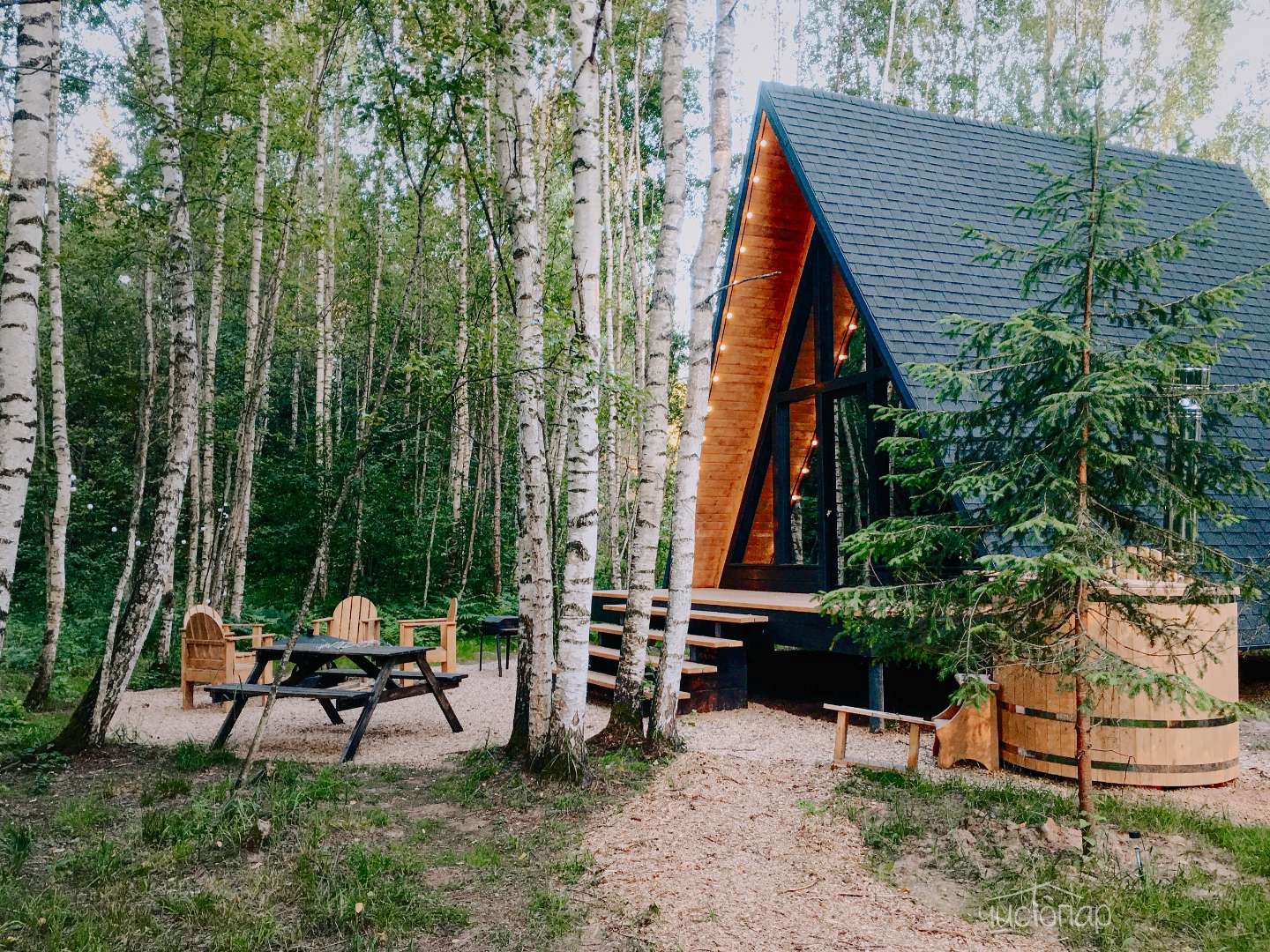 Треугольный Дом с ванной 55м2На территории находится два Треугольных домика A-Frame 55 кв.м., это домики повышенного комфорта. Они совершенно одинаковые и отличаются только названиями: «Осинка» и «Ивушка».