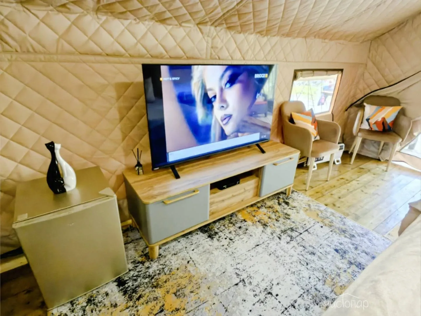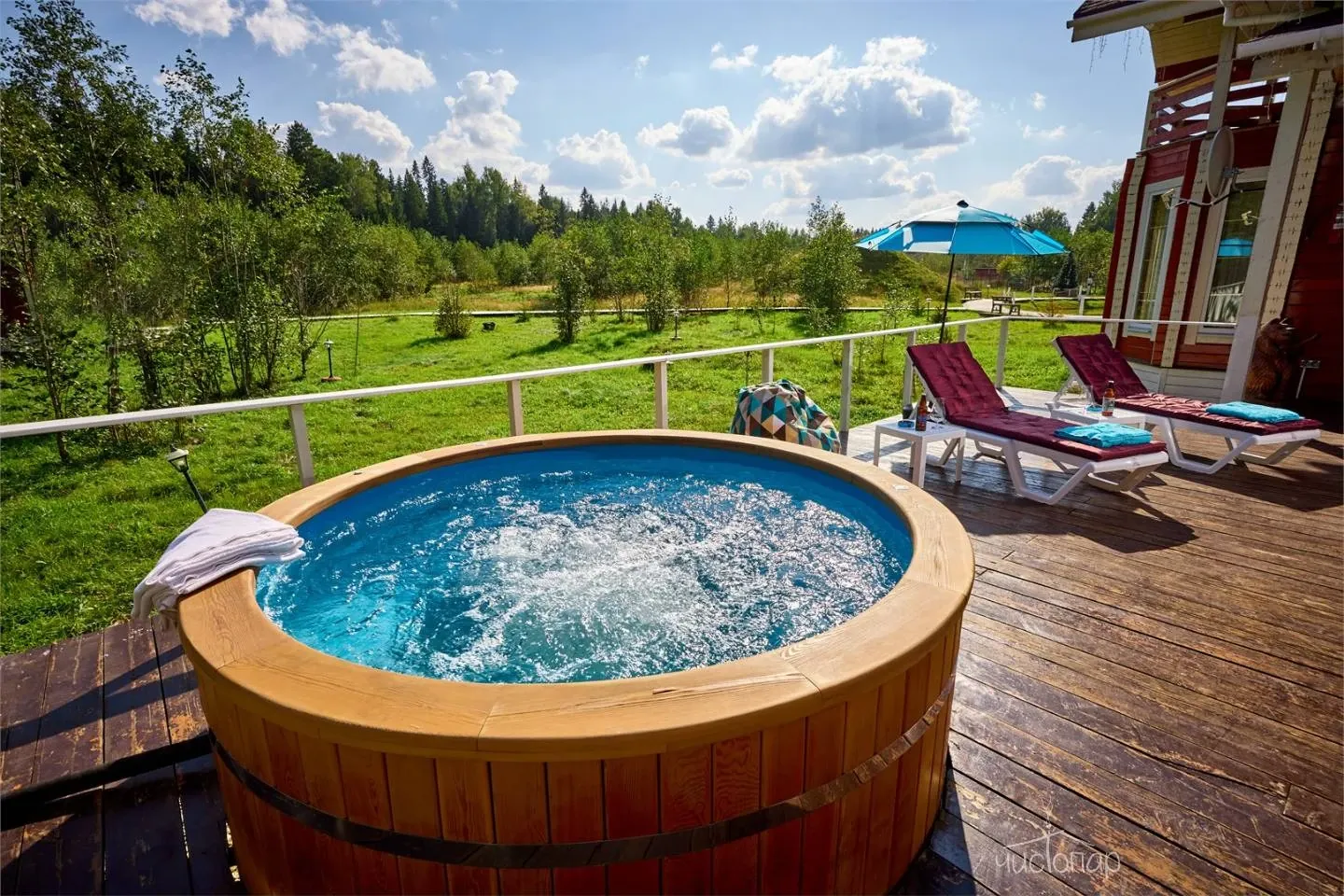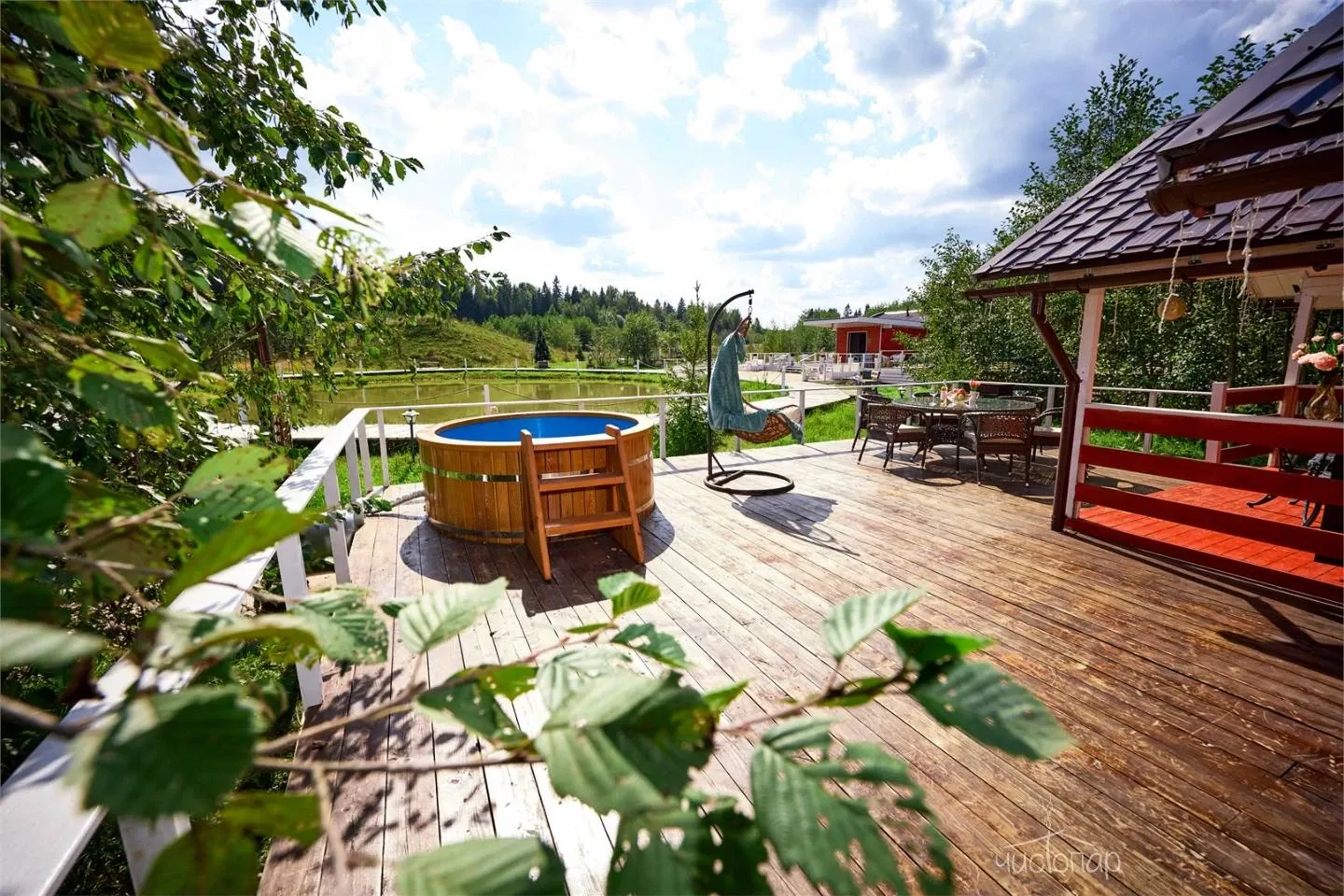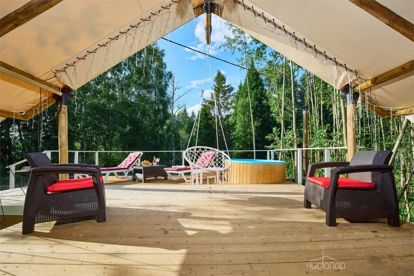 На территории глэмпинга есть баня, купель на дровах под открытым небом.