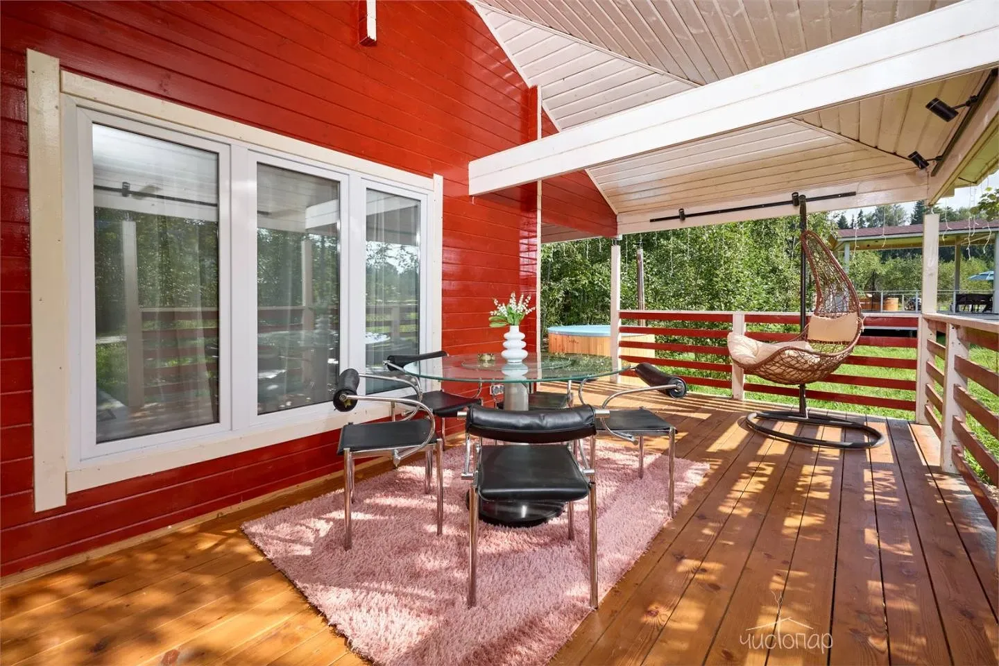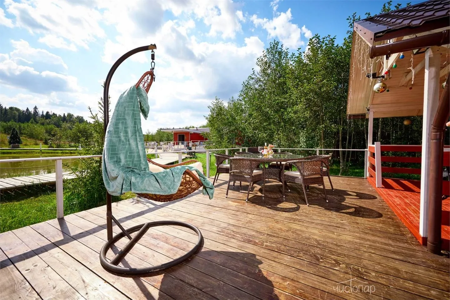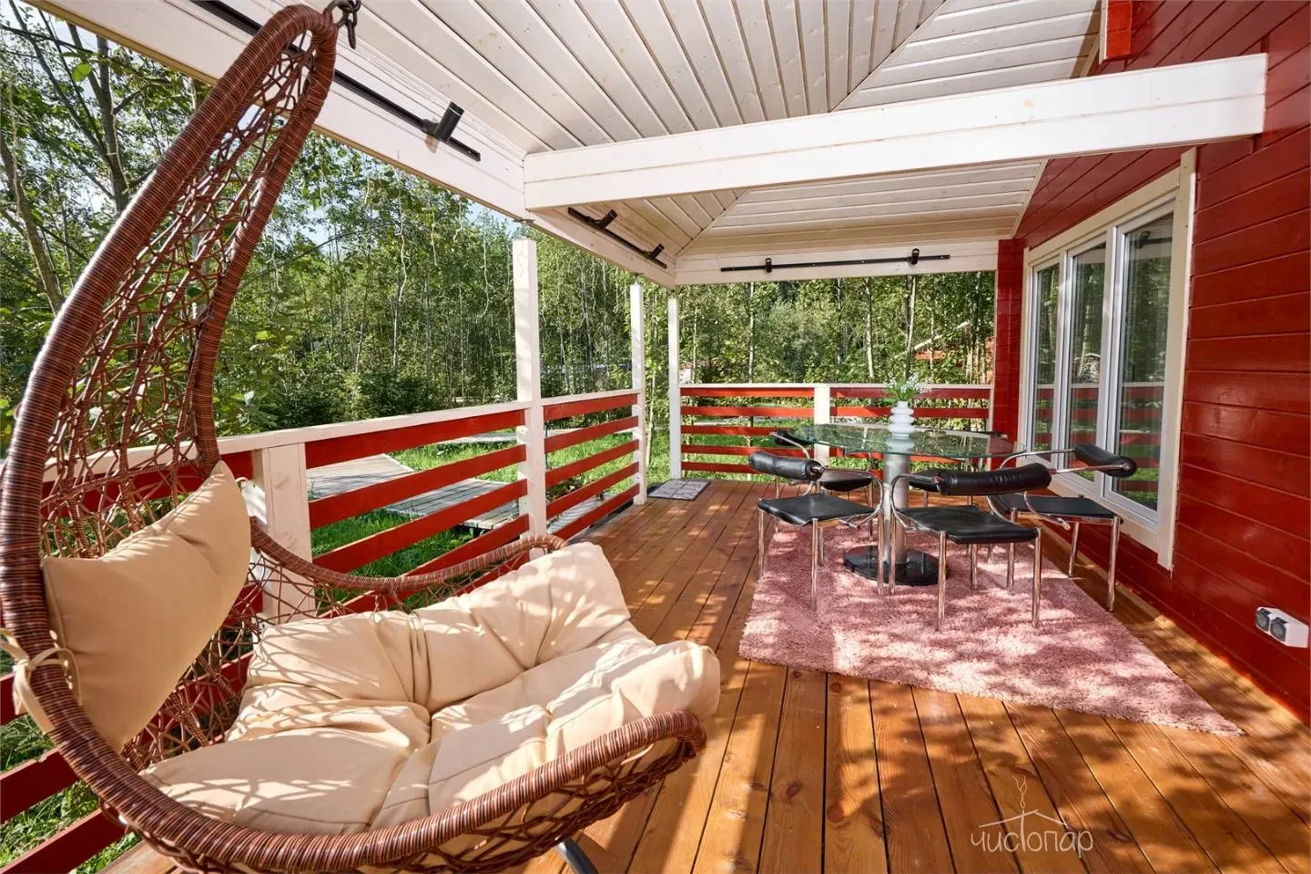 Общая коммунальная зона в стиле ШАЛЕ — камин, столовая, веранда с уличной мебелью и зоной барбекю.