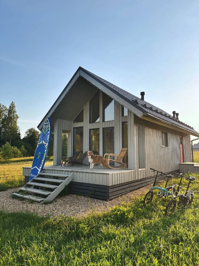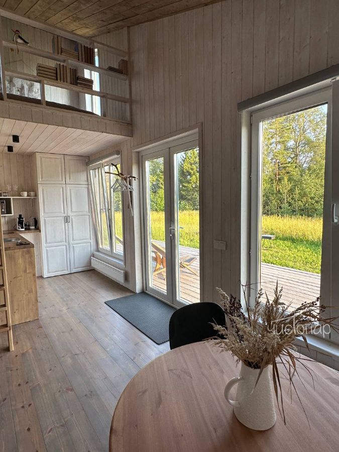 ЧерникаДом с террасой и зоной барбекю. На первом этаже расположены: Кухня-гостиная с раскладным диваном, камином, телевизором и полностью оборудованной кухней; Совмещённый санузел с душем. На мансардном этаже располагается спальня с двуспальной кроватью.