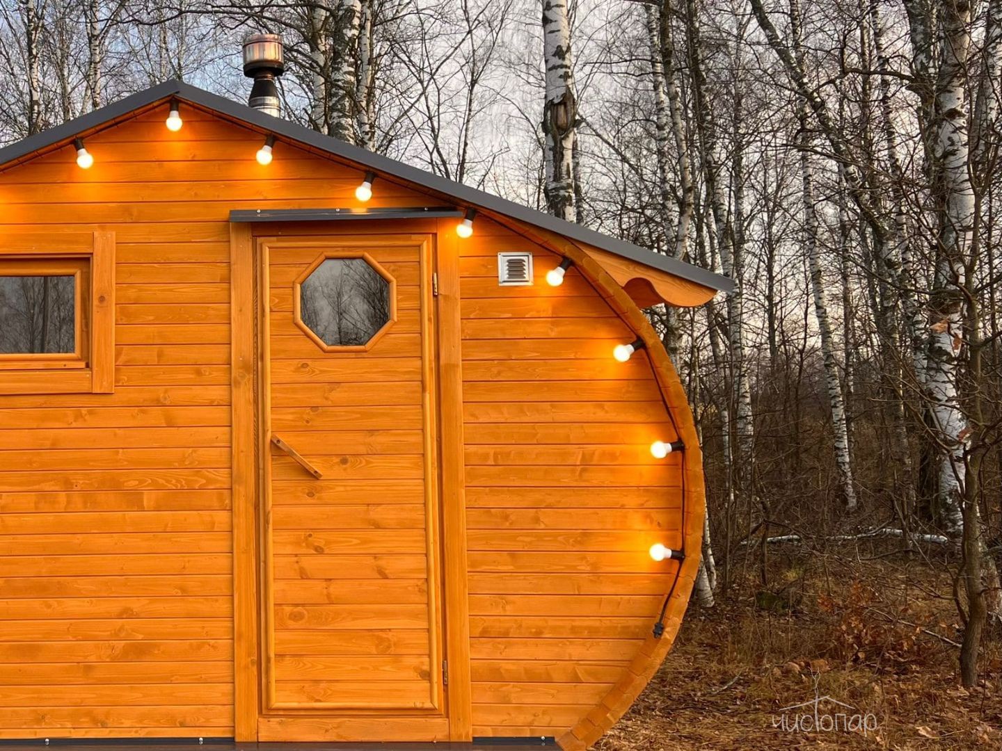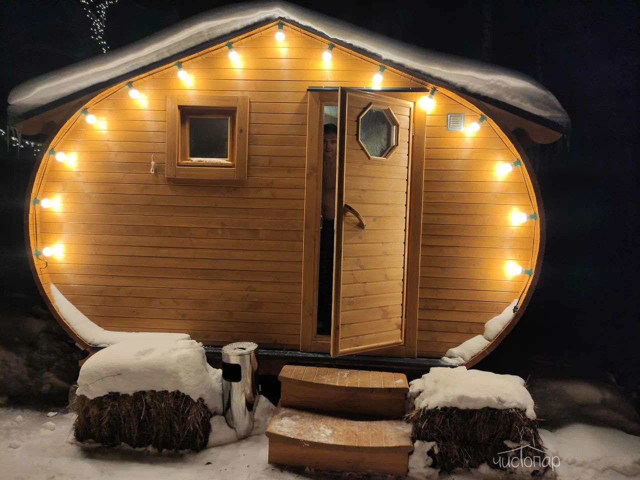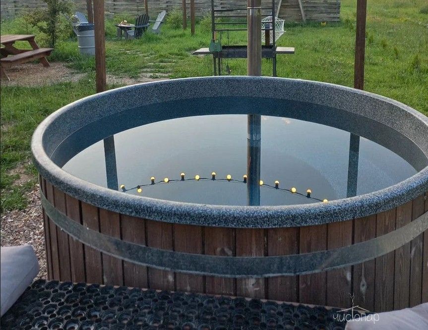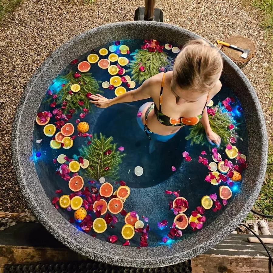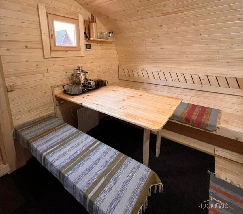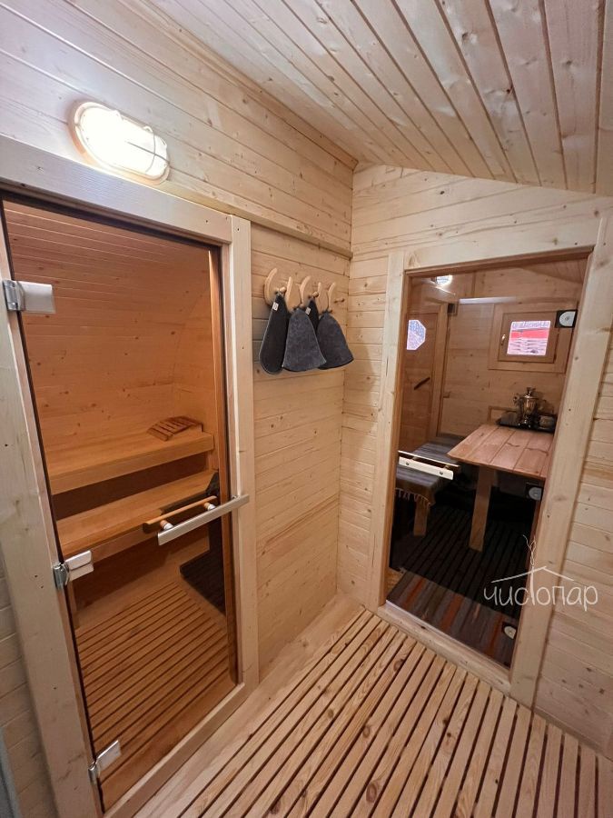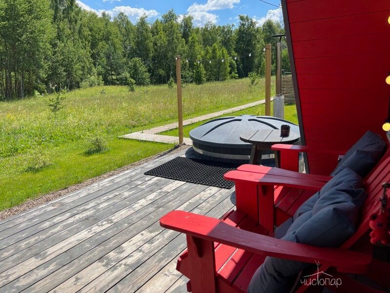 На просторной террасе каждого домика находится подогреваемая купель на родниковой воде. Для любителей хорошего жара есть баня с зоной чаепития.