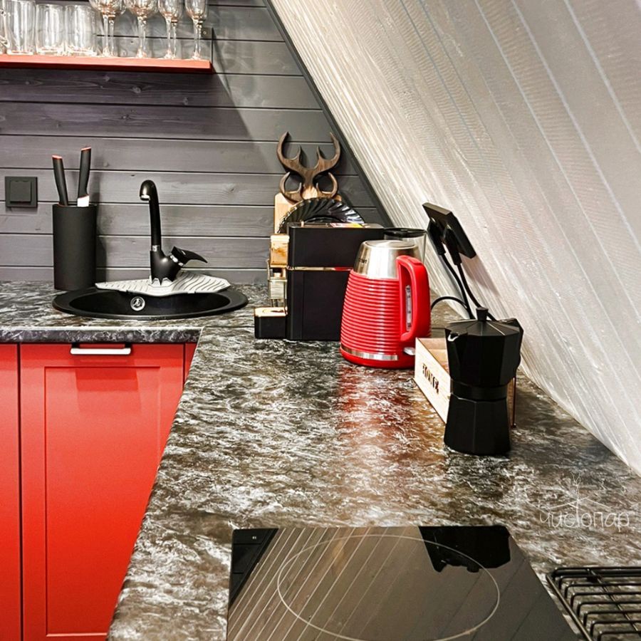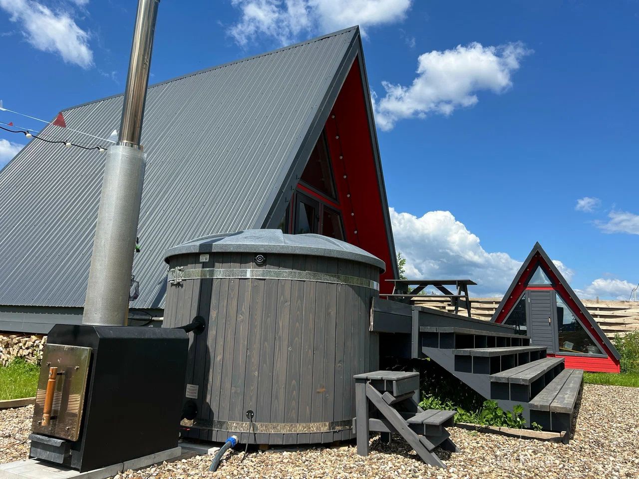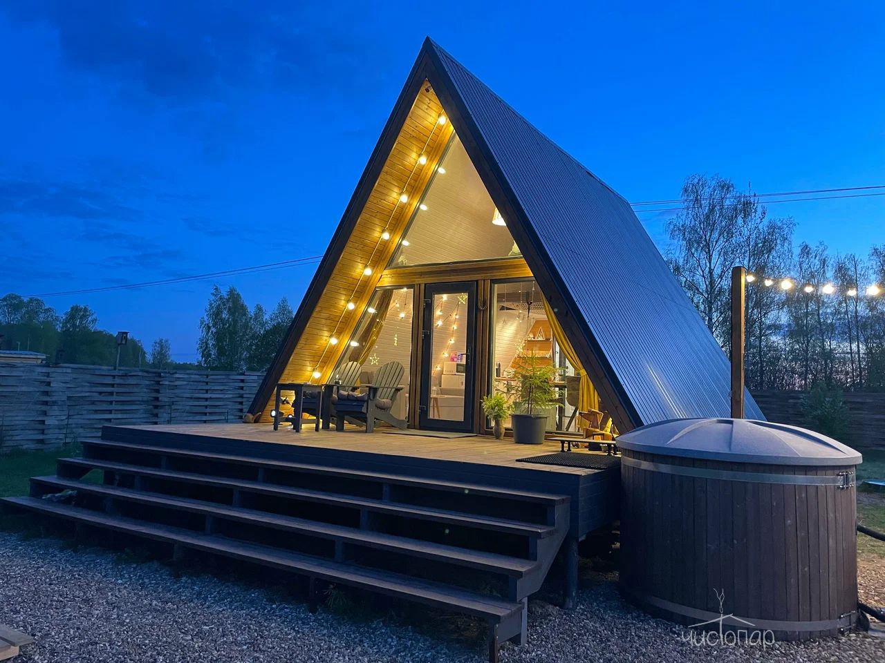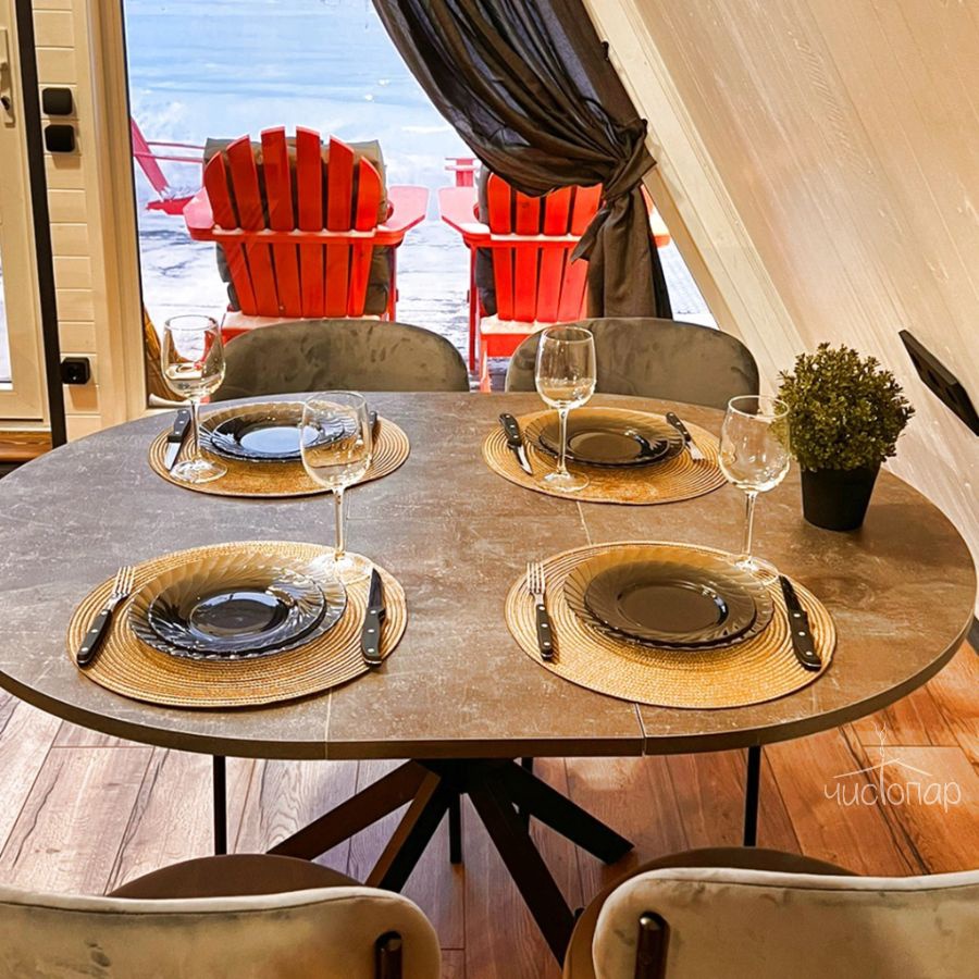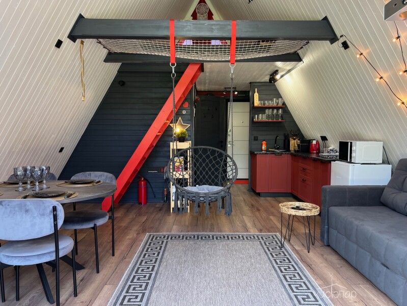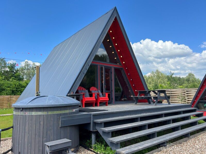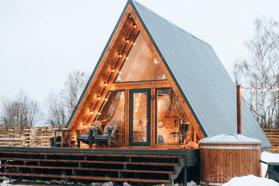 A-Frame ICEA-Frame ICE дом площадью 52 м² для круглогодичного проживания. Дом рассчитан на размещение 4 человек. На террасе дома установлена уличная подогреваемая купель Фурако и 2 комфортных кресла адирондак. В доме есть кухня со всем необходимым для приготовления еды: холодильник с мини-морозилкой, гейзерная кофеварка, электрочайник, заварочный чайник, варочная панель, микроволновая печь, кондиционер. В доме 4 спальных места (двуспальная кровать и раскладной диван), комфортный санузел, колонка Алиса, настольные игры и многое другое.