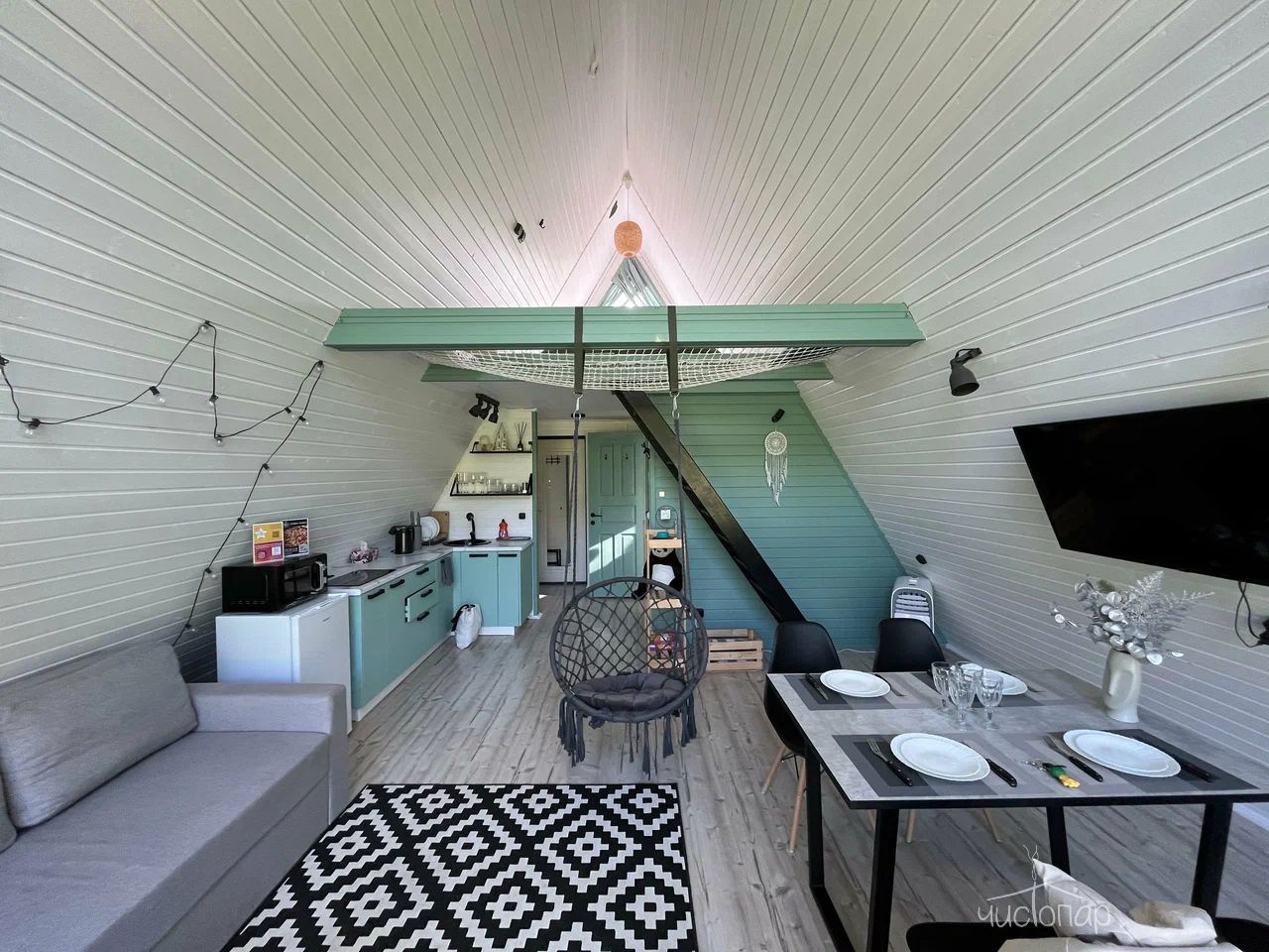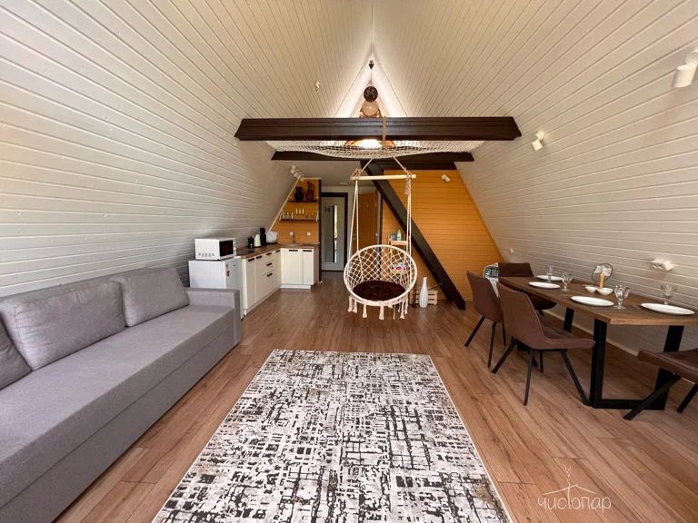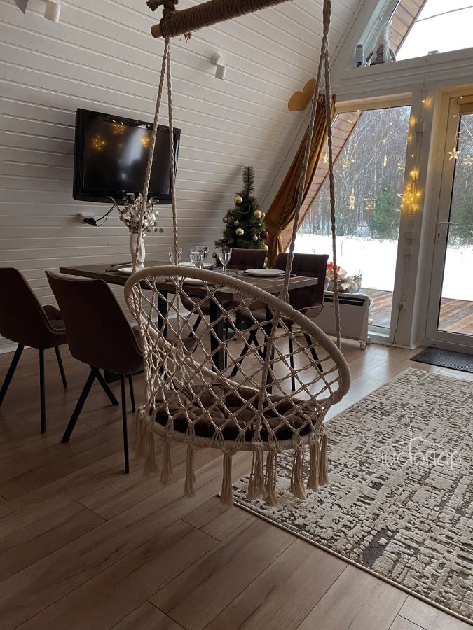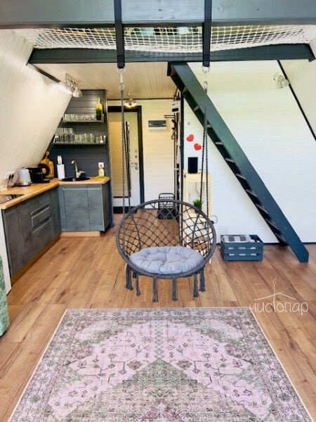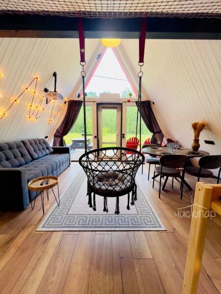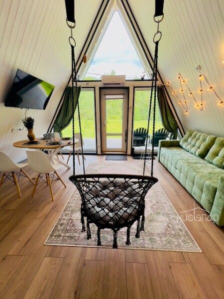 A-Frame MINTРоскошный А-фрейм в нежных мятных тонах, с горячей купелью фурако на веранде и роскошным видом на опушку леса. Панорамное остекление, сетка-гамак на втором этаже, напольный вентилятор, быстрый и бесплатный WiFi, Smart TV, диско-шар, кухня для приготовления еды, чайно-кофейный уголок. Четыре спальных места, комфортный санузел со всеми удобствами.