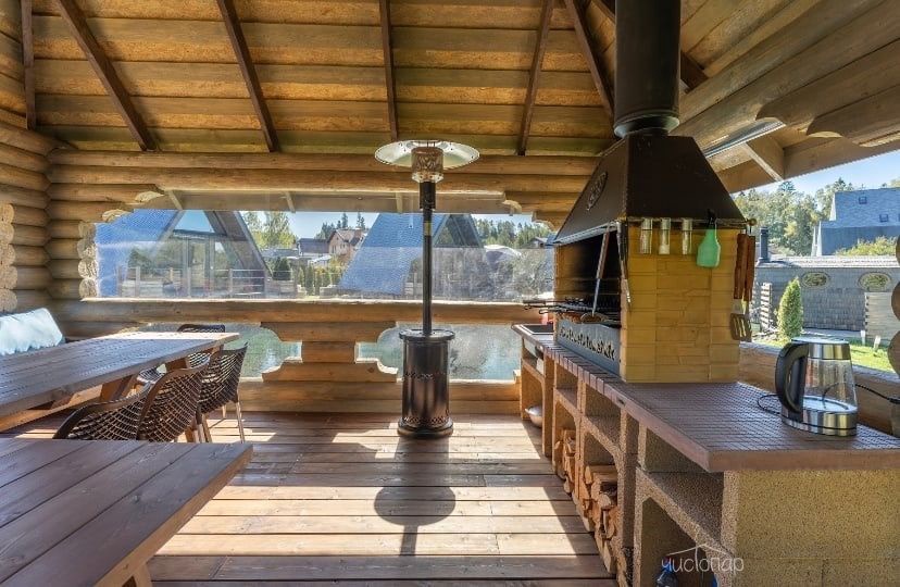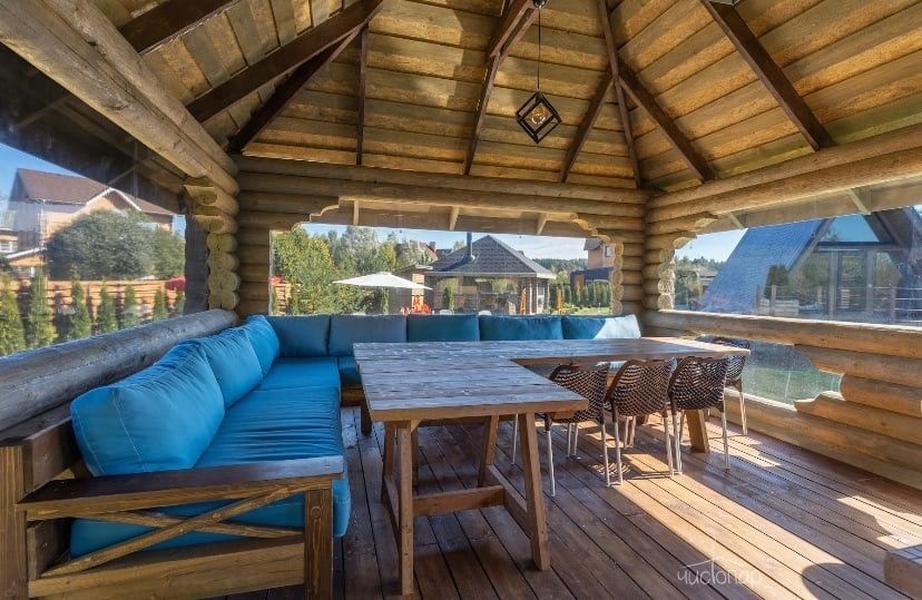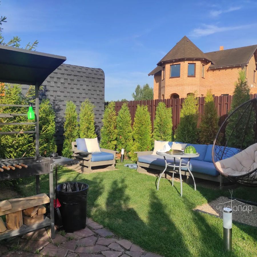 • своё пространство с летней мебелью, диваном и зоной мангала/ камина на улице