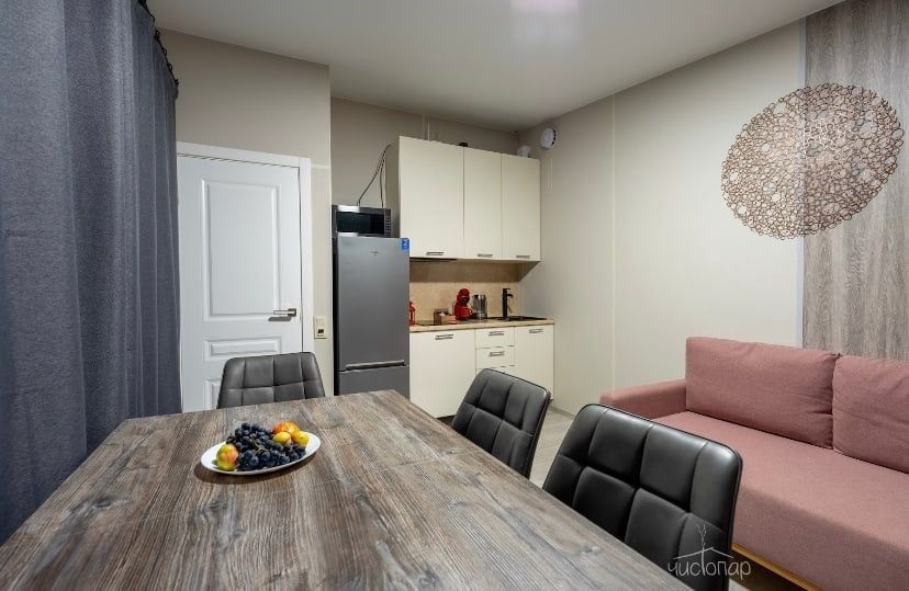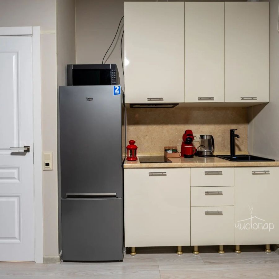 Оборудованная кухня с холодильником, чайником, плитой, СВЧ-печью, кофемашиной
