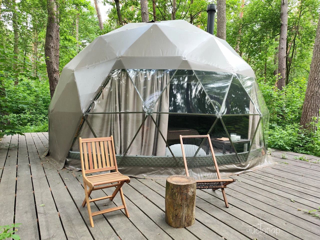 В глэмпинге 40 жилых модулей, в них уютно и просторно — 28 м2 площадь и потолок 3,5 м. В каждом модуле двуспальная широкая кровать с белоснежным бельем, умывальник, розетки, продуманная вентиляция и, конечно, большое панорамное окно с видом на лес. На веранде можно сидеть в шезлонгах.