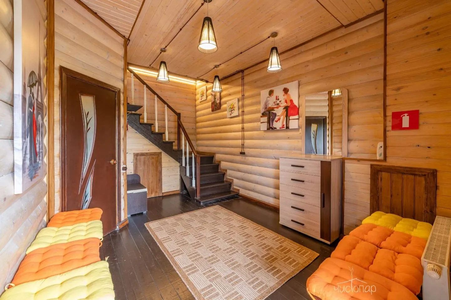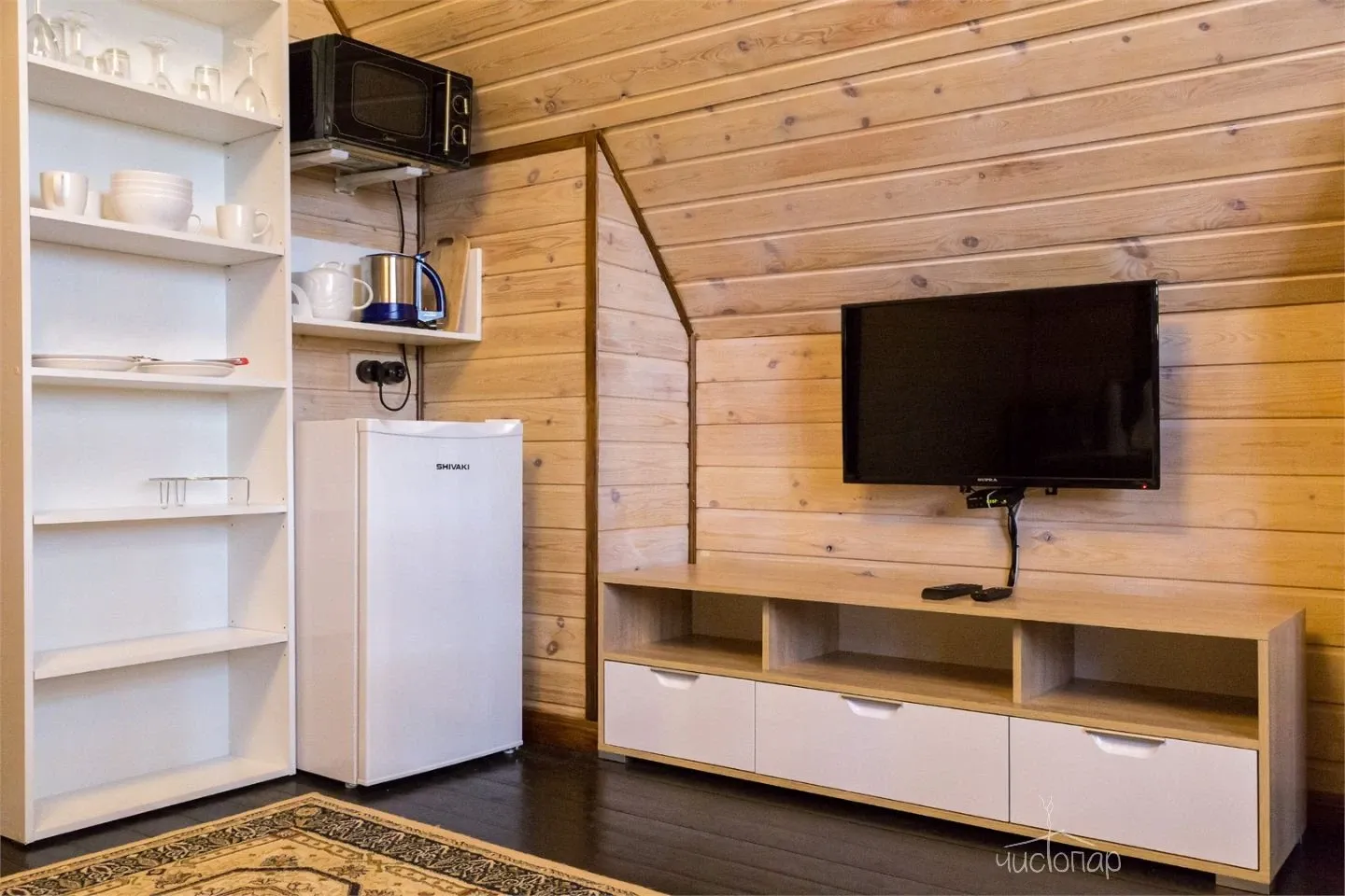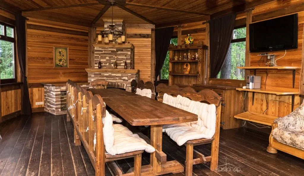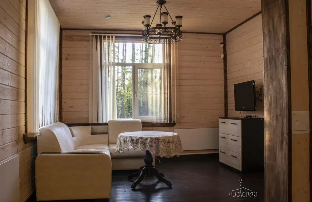 Коттедж с русской баней, хамамом и купелью оснащен всем необходимым для комфортного загородного отдыха семьей или компанией: 1-ой гостиной комнатой с обеденным столом на 8 человек, 3-мя спальными комнатами с двухместными кроватями, 2-мя туалетными комнатами, 2-мя душевыми кабинами при бане, хамамом, русской баней на дровах, зоной для барбекю с мангалом и садовой мебелью, 1-им ТВ.