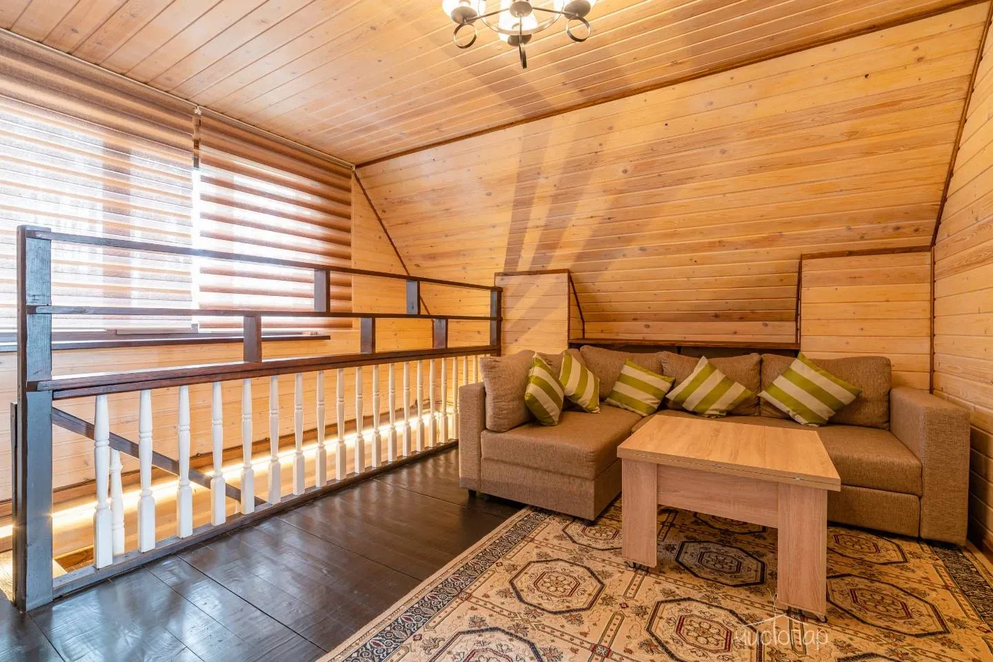 Современный 2-х этажный коттедж с сауной оснащен необходимой мебелью и оборудованием для загородного отдыха семьей или небольшой компанией: 1-ой гостиной комнатой с раскладным диваном, 1-ой спальной комнатой с двухместной кроватью, 1-ой туалетной комнатой с душевой кабиной, финской сауной, кухней и зоной для барбекю, 2-мя ТВ.