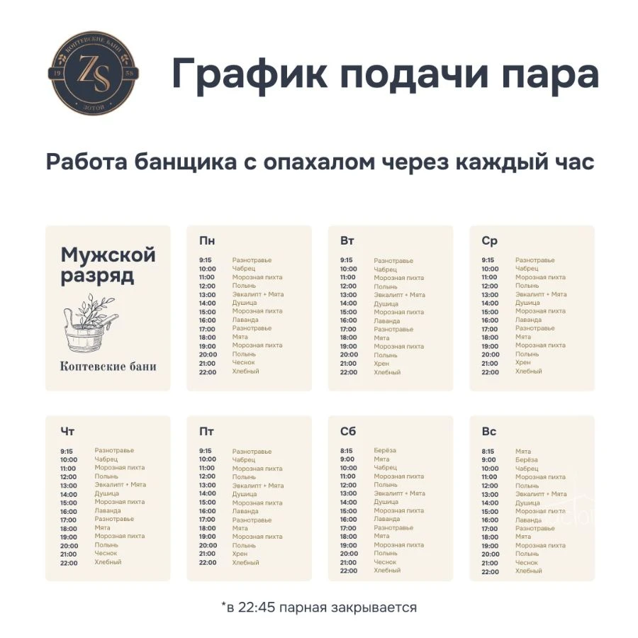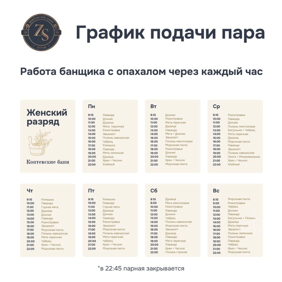 Добро пожаловать в Коптевские бани! Просим уважать правила чистоты и порядка, пользоваться предоставленными аксессуарами и соблюдать спокойствие. Оценивайте свои силы перед посещением парных процедур. В бане работают мужские и женские отделения. Наслаждайтесь атмосферой, прохладой ледяной купели и качественным парением от наших мастеров. Желаем вам отличного отдыха и крепкого здоровья!