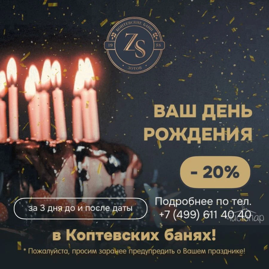 Скидка 20% имениннику ку 3 дня до и 3 дня после Дня Рождения