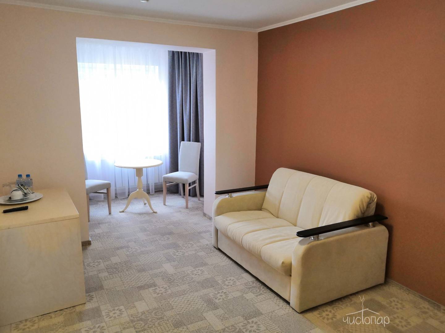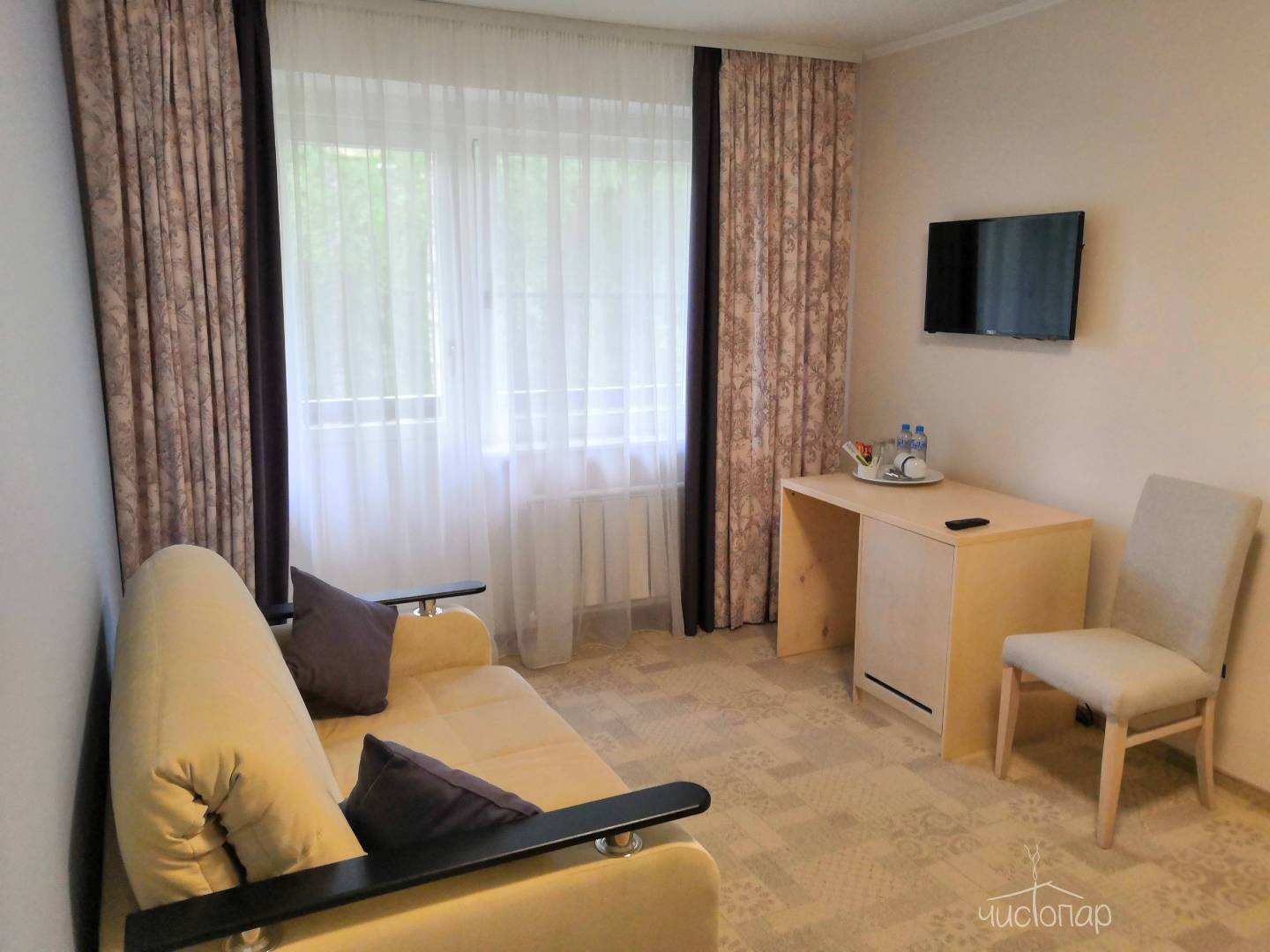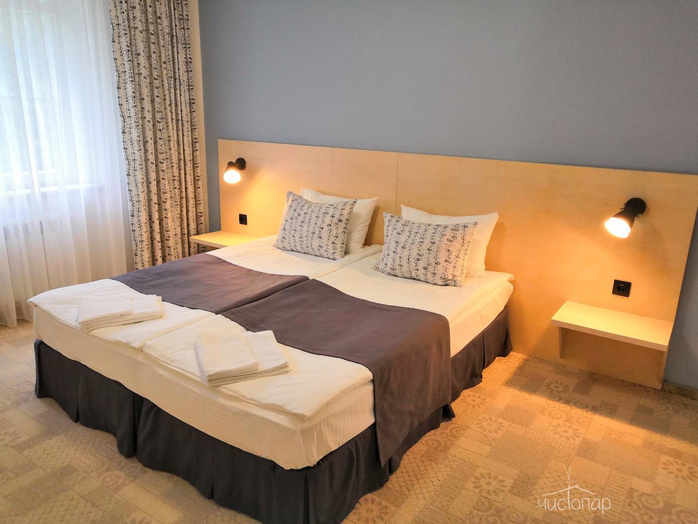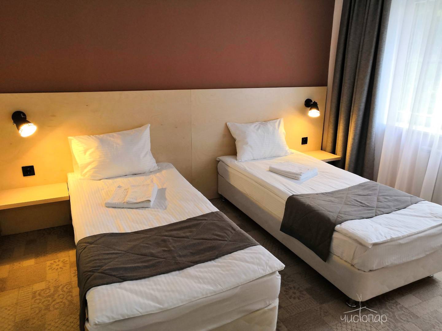 На территории комплекса находится четырехэтажный трехзвездочный отель с 44 номерами, предлагающими категории Стандарт двухкомнатные и Deluxe. Отель способен комфортно разместить до 120 гостей.