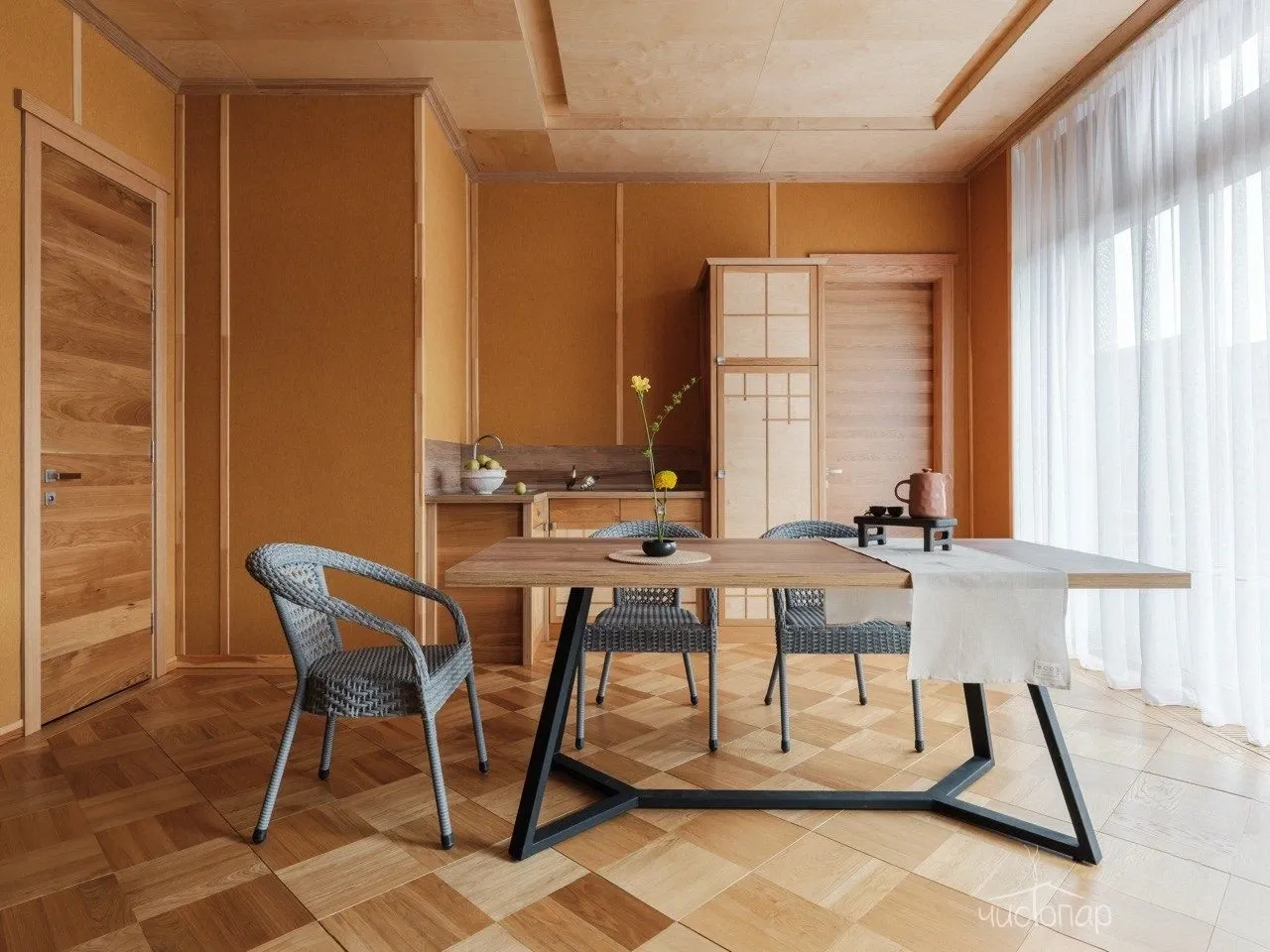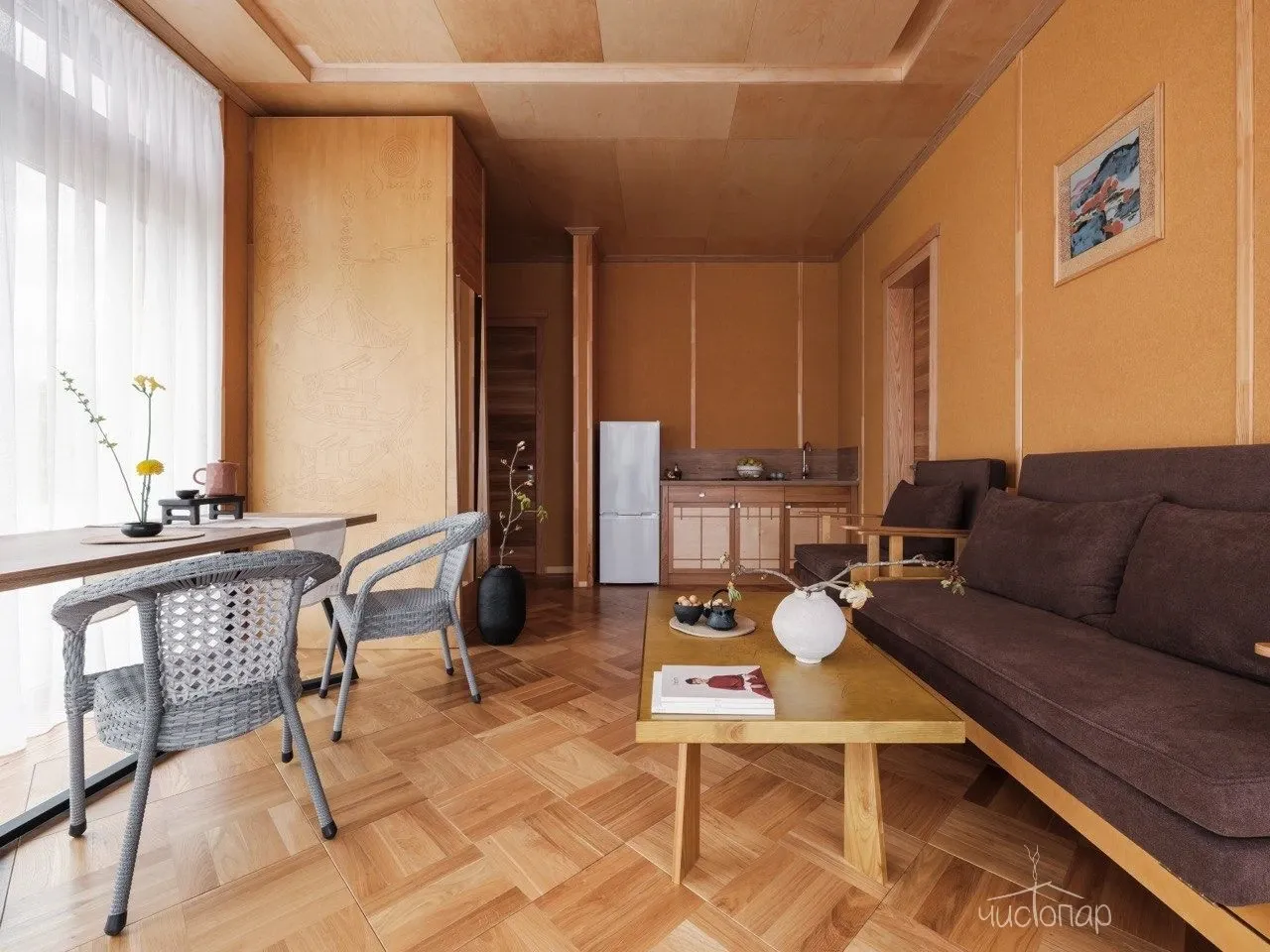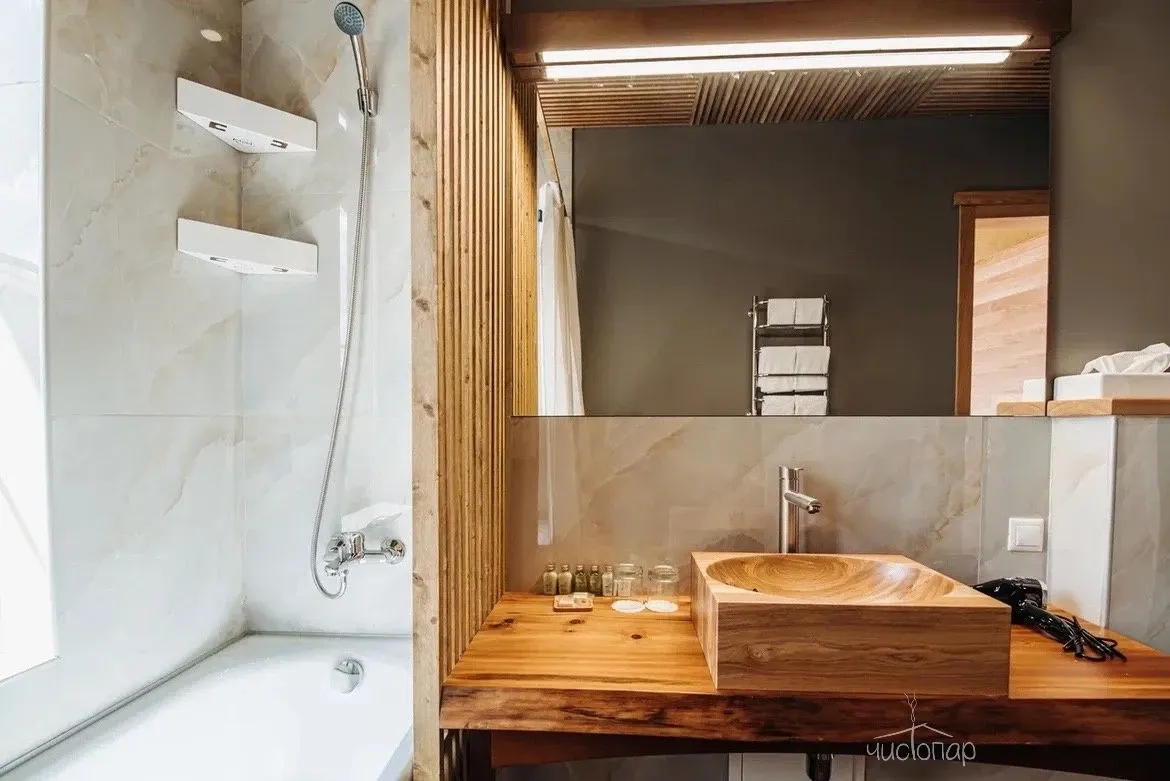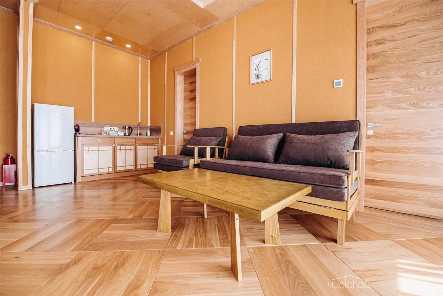 Номер категории DELUXE с Бочкой Фурако представляет собой просторный номер, обставленный в современном стиле и оборудованный всем необходимым для комфортного пребывания. В номере есть большая кровать с ортопедическим матрасом. Ванная комната оборудована современными санитарными приборами и имеет все необходимые удобства, включая ванну, фен, полотенца и туалетные принадлежности. Кухня оборудована всем необходимым для приготовления пищи. В ней есть плита с духовкой, холодильник, кофеварка и чайник. Также в кухне есть полный набор посуды, столовых приборов и кухонных принадлежностей. Всегда можно воспользоваться услугами ресторана или заказать еду в номер.