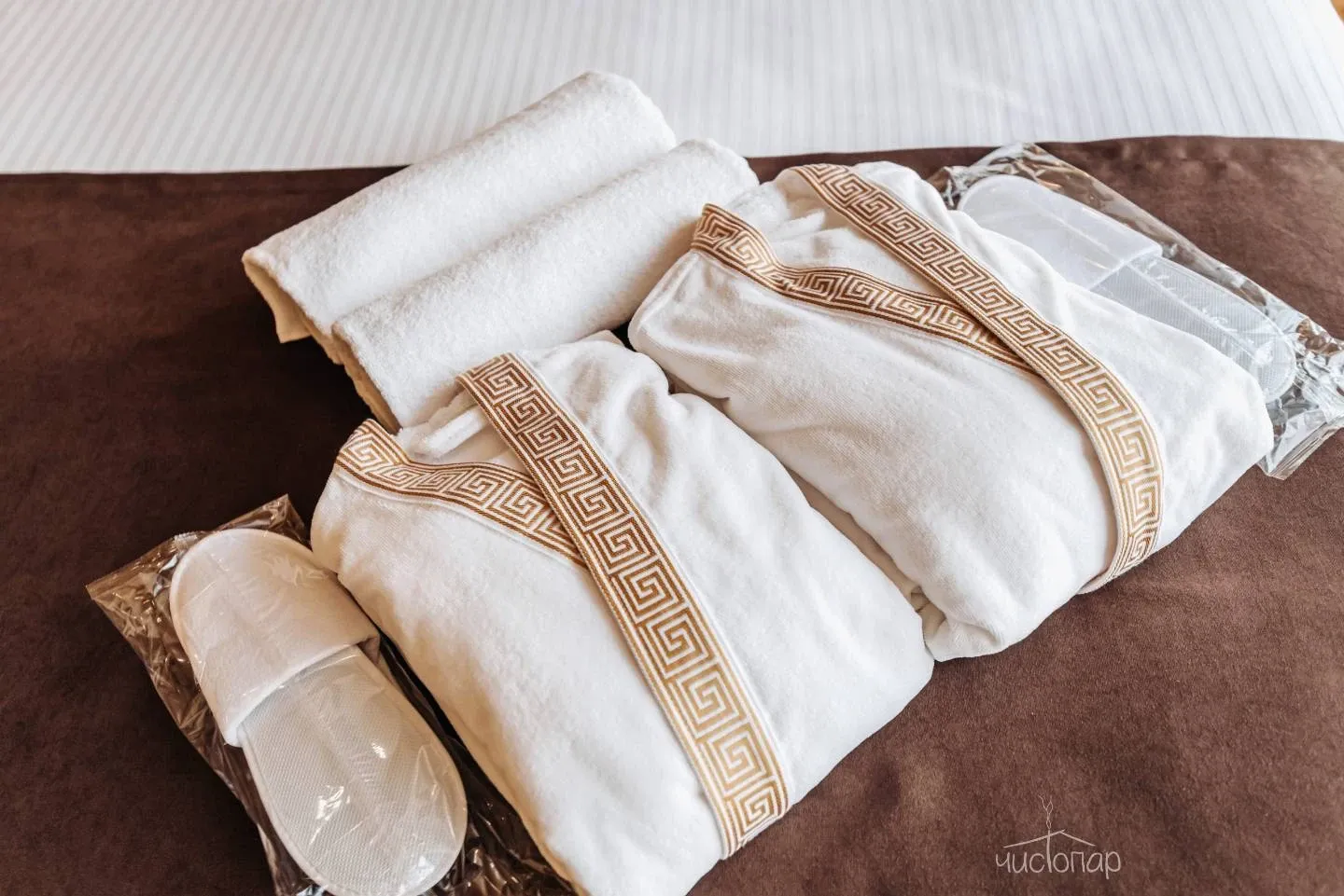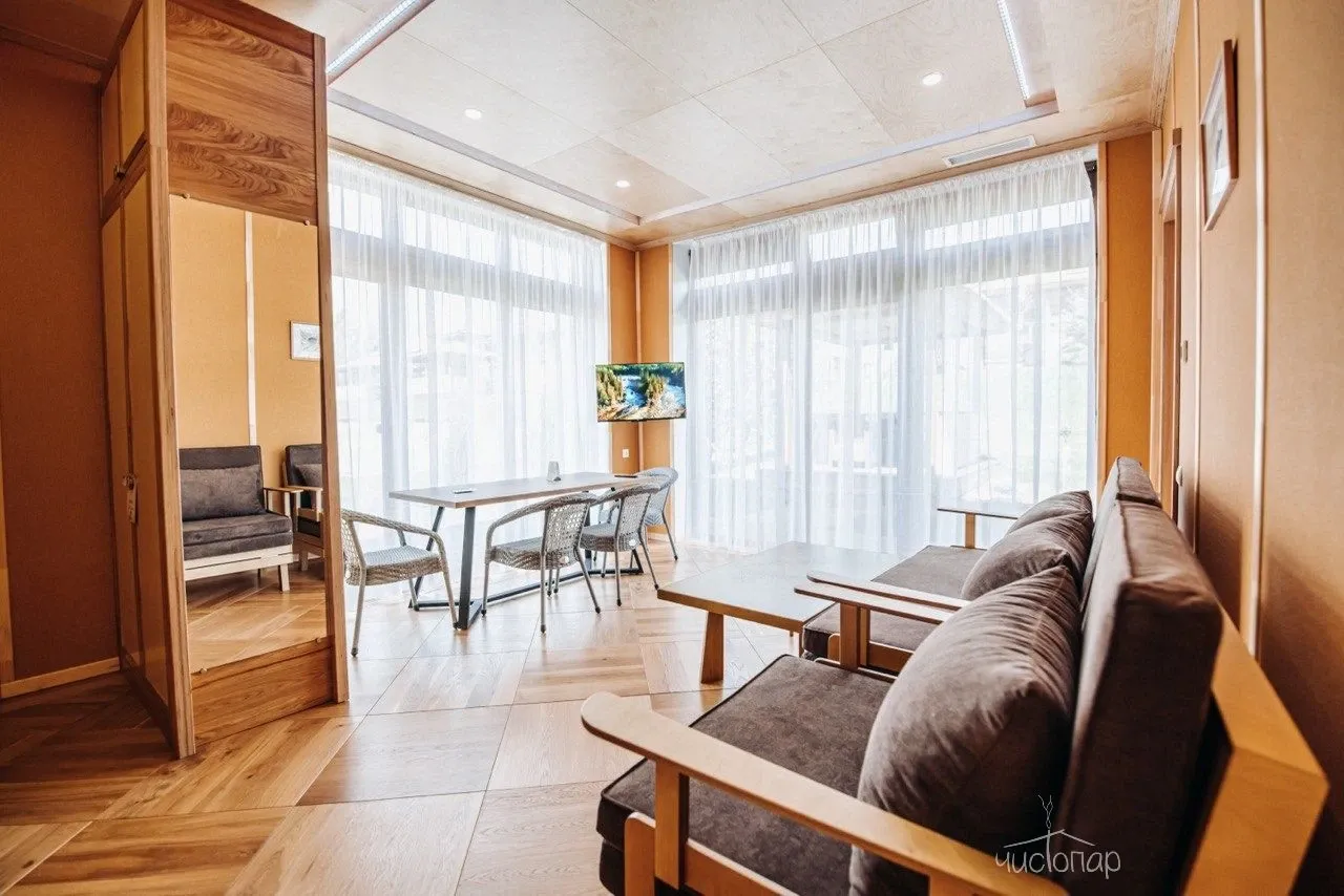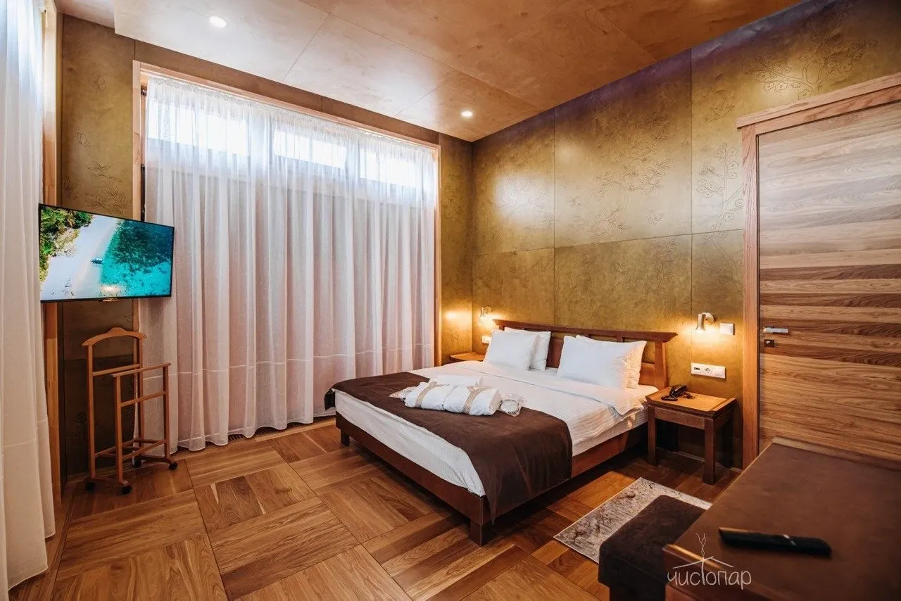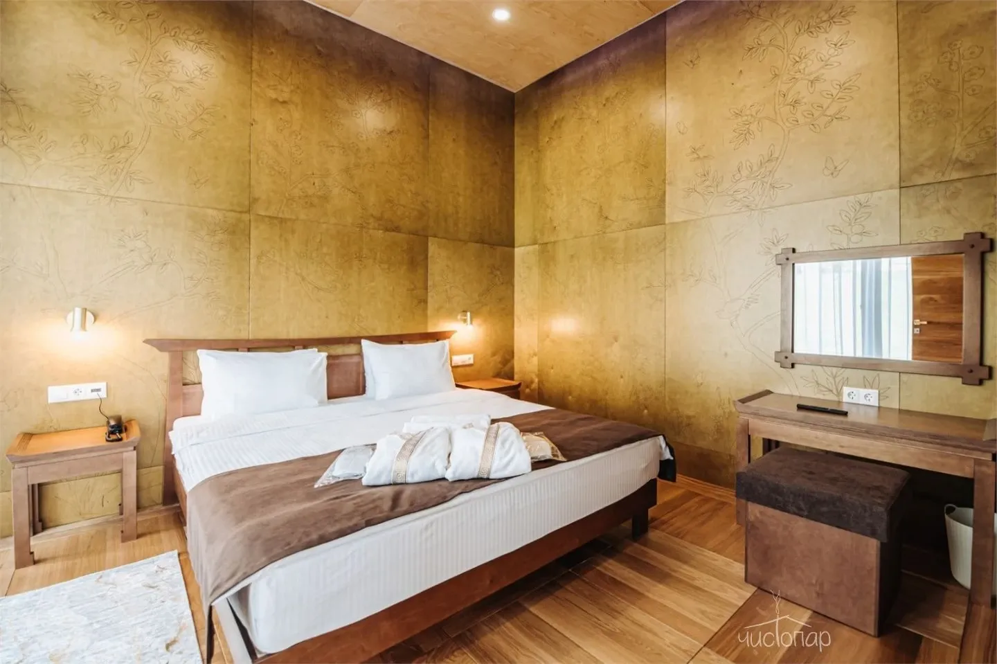 Номер категории DELUXE представляет собой просторный номер, обставленный в современном стиле и оборудованный всем необходимым для комфортного пребывания. В номере есть большая кровать с ортопедическим матрасом. Ванная комната оборудована современными санитарными приборами и имеет все необходимые удобства, включая ванну, фен, полотенца и туалетные принадлежности. Кухня оборудована всем необходимым для приготовления пищи. В ней есть плита с духовкой, холодильник, кофеварка и чайник. Также в кухне есть полный набор посуды, столовых приборов и кухонных принадлежностей. Всегда можно воспользоваться услугами ресторана или заказать еду в номер.