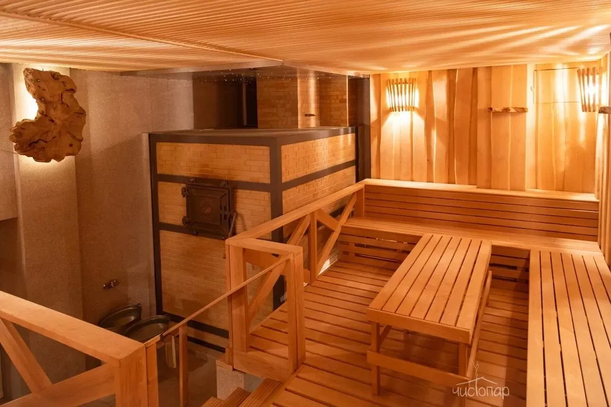Комплекс предлагает Классическое парение, парение с пихтовыми вениками, а также комплекс "Мужская сила". Дополнительно доступны массаж, SPA-процедуры и блюда русской/европейской кухни.
