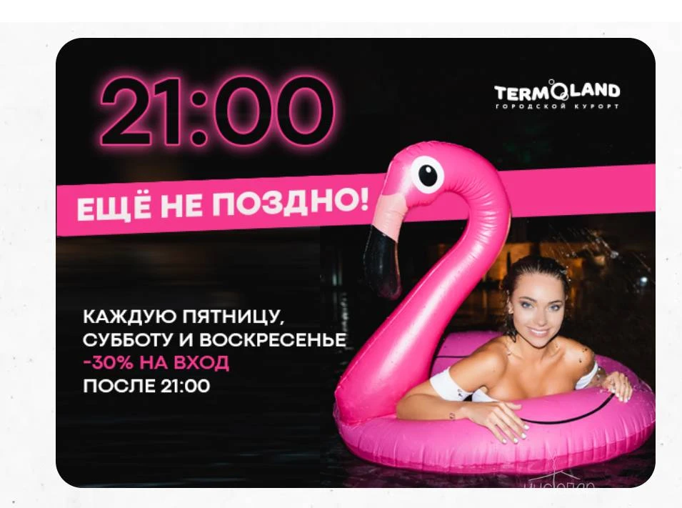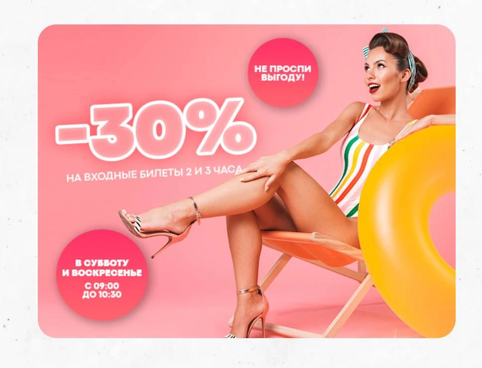 Новое предложение для тех, кому нравится отдыхать в конце недели допоздна! Каждую пятницу, субботу и воскресенье с 21:00 до 22:00** вы можете купить входной билет со скидкой -30%