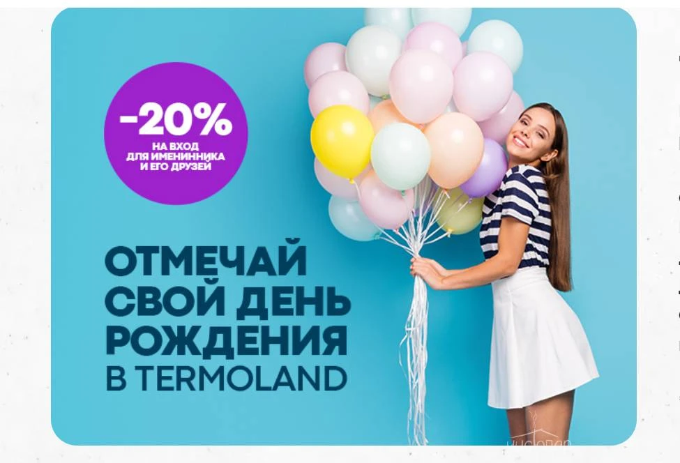 Поздравляем с Днем рождения и дарим скидку 20% на разовое посещение нашего комплекса. Скидка действует в День рождения и 7 дней после.