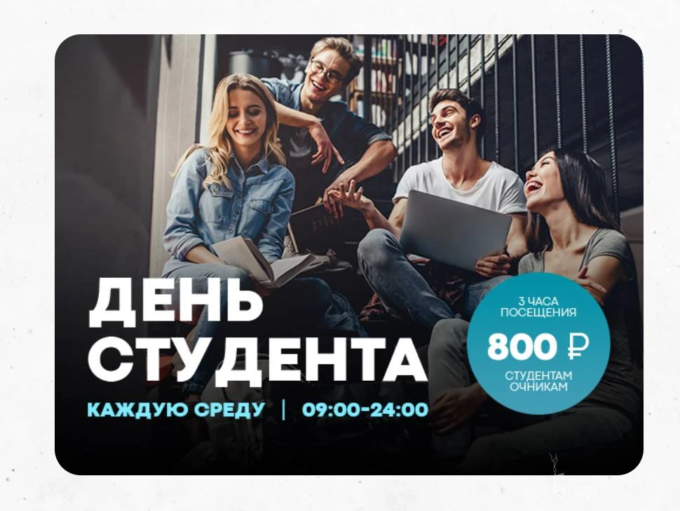 При предъявлении студенческого билета по средам студенты очных отделений могут купить входной билет по специальному тарифу — 800 руб. за 3 часа посещения!
