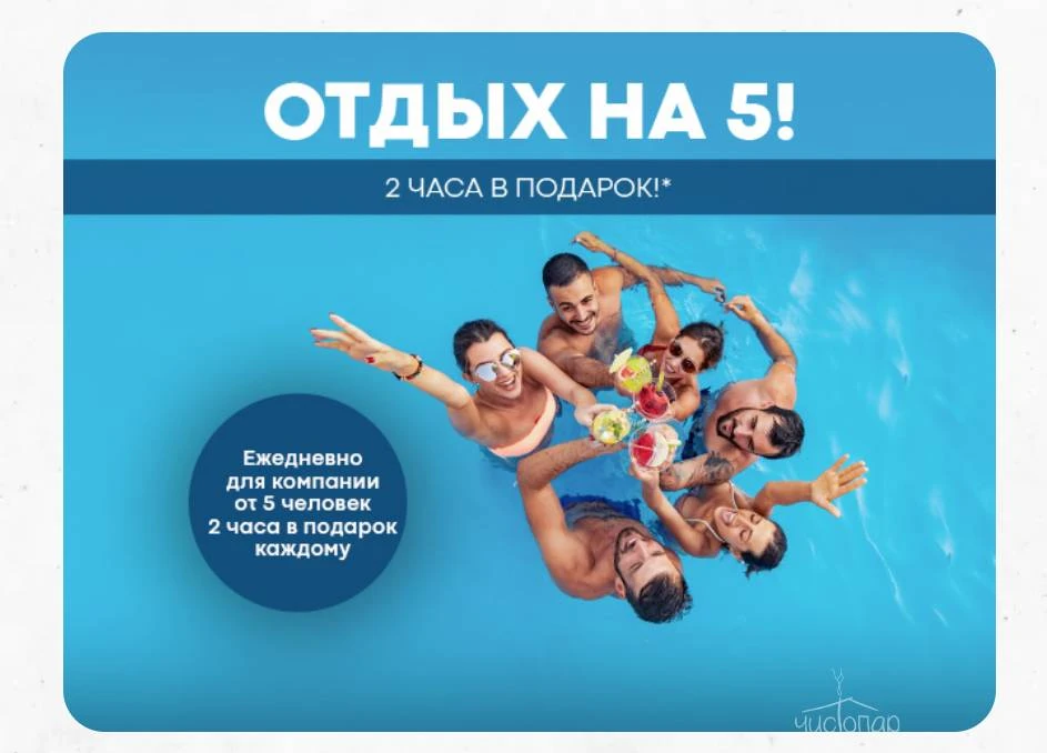 Акция действительна для компании из 5 и более гостей, купивших входной билет на 2 часа (стандартный, льготный, детский) единовременно. Все гости получают 2 часа в подарок. При единовременной оплате билета на 3 часа гости получают безлимит.