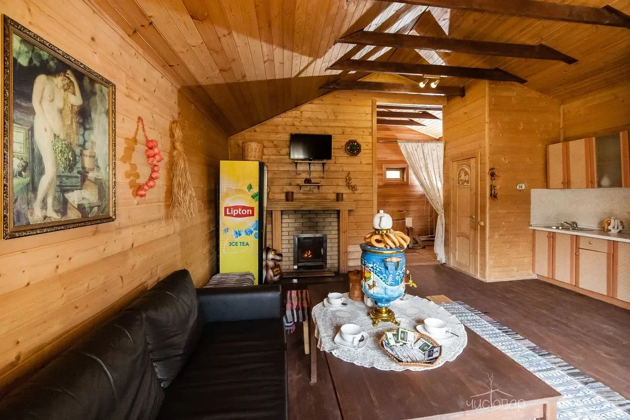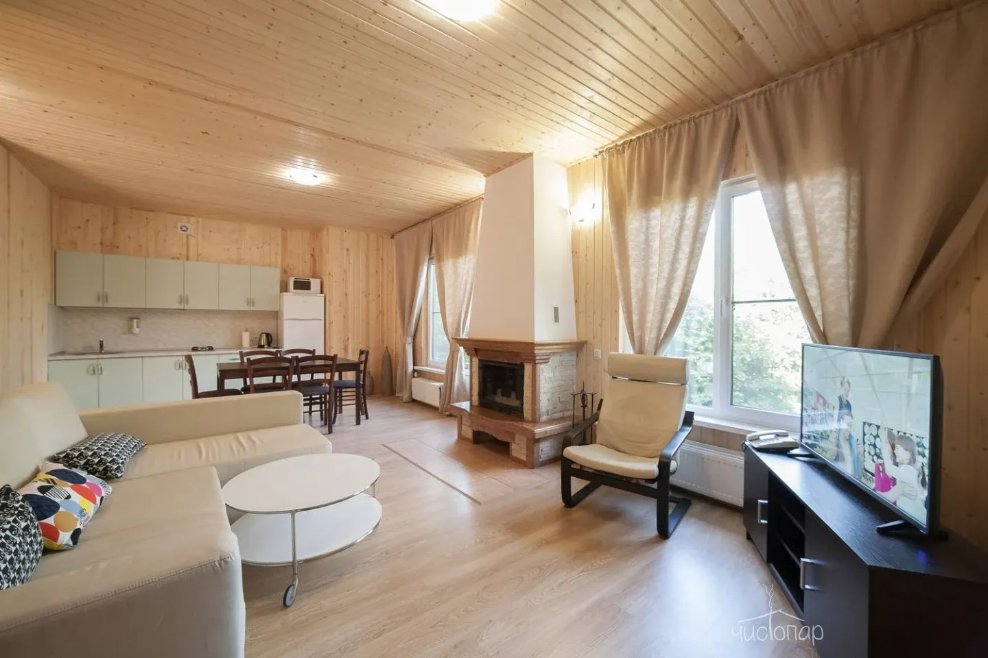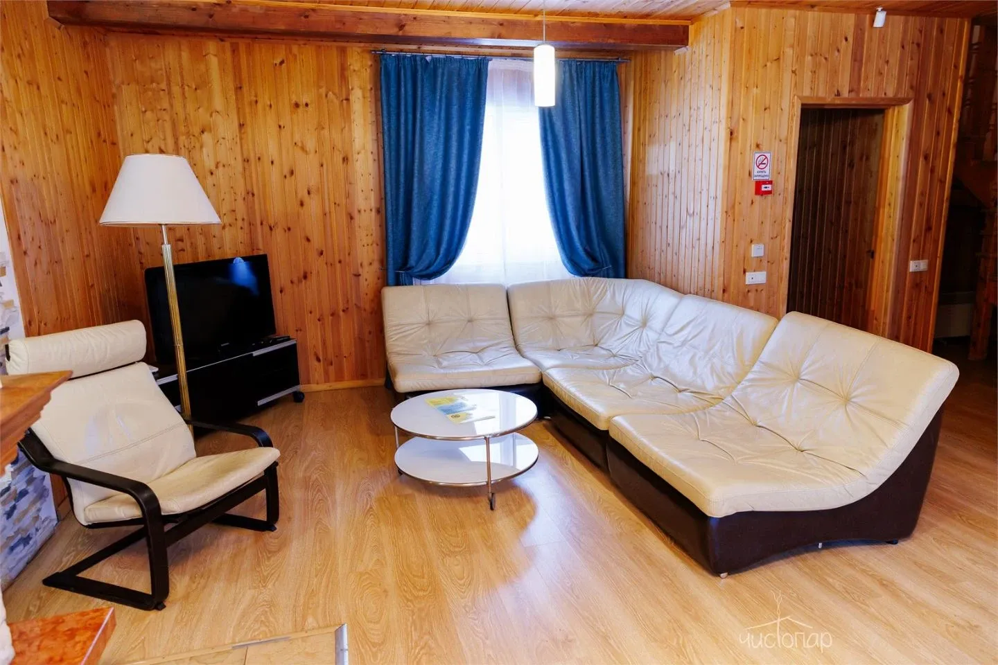 В коттедже: Гостиная с набором мягкой мебели и кухней, газовая плита; Два LCD TV; 3 спальни: одна с двуспальной кроватью и две с двумя односпальными кроватями; Душевая комната с сауной на 1 этаже и душевая комната в комнате с двуспальной кроватью на 2 этаже.