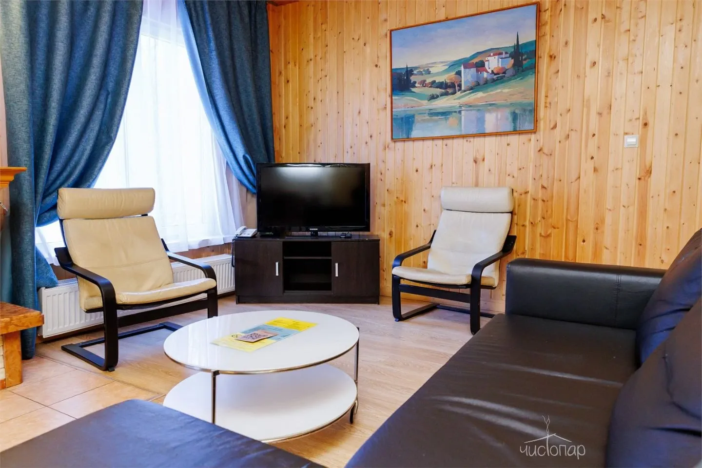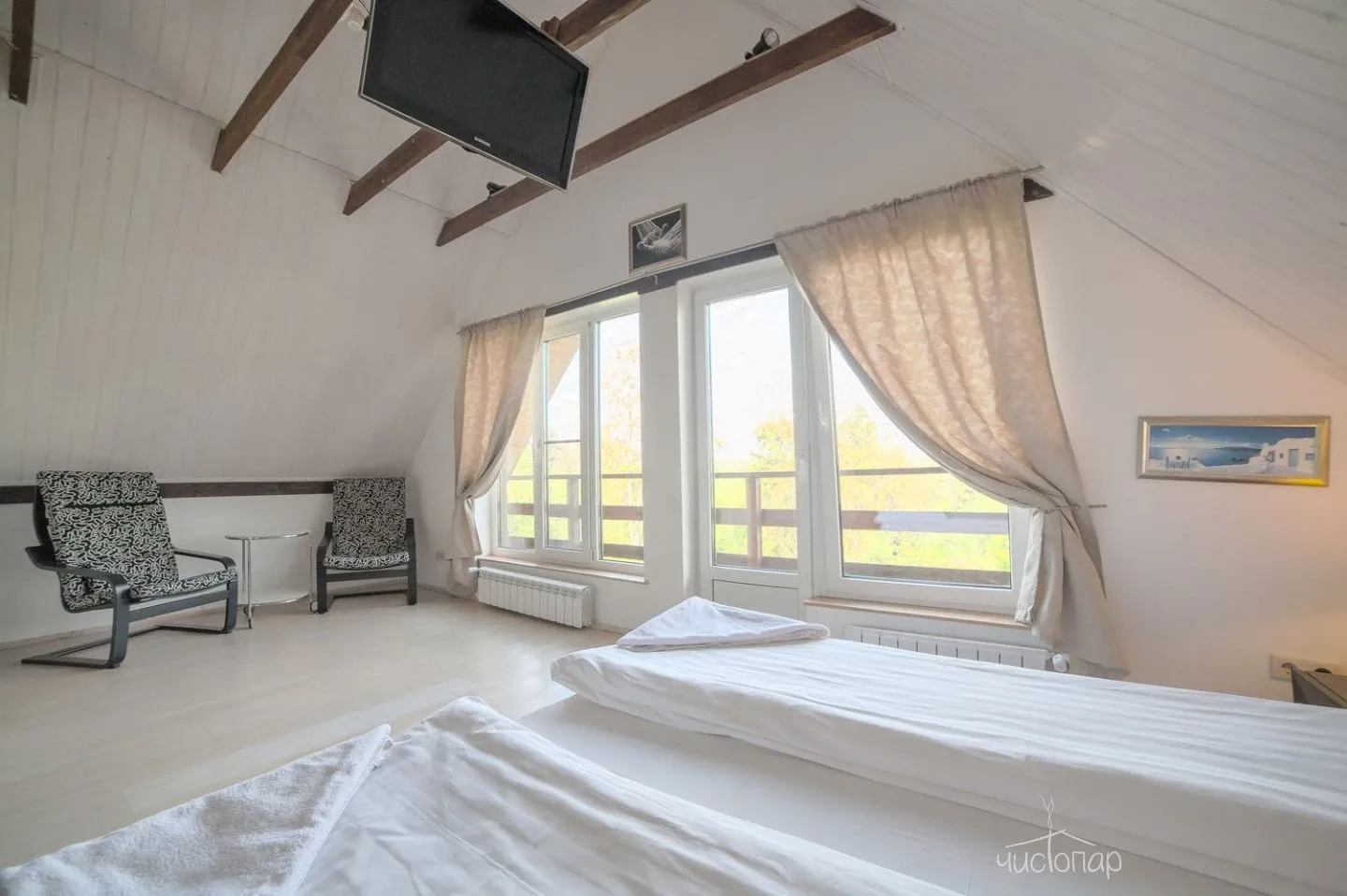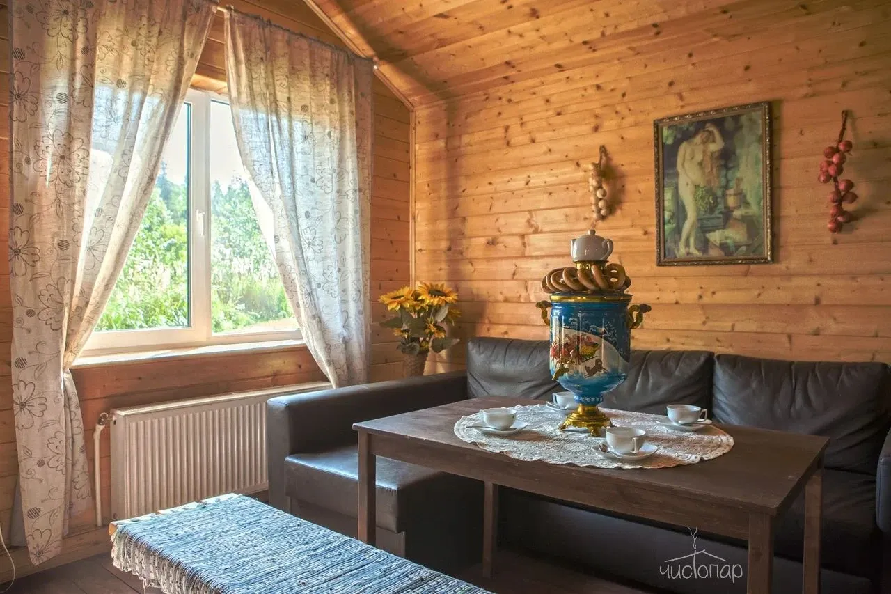 В коттедже: Гостиная с набором мягкой мебели и кухней, газовая плита; Два LCD TV; 3 спальни: одна с двуспальной кроватью и две с двумя односпальными кроватями; Душевая комната с сауной на 1 этаже и душевая комната в комнате с двуспальной кроватью на 2 этаже.